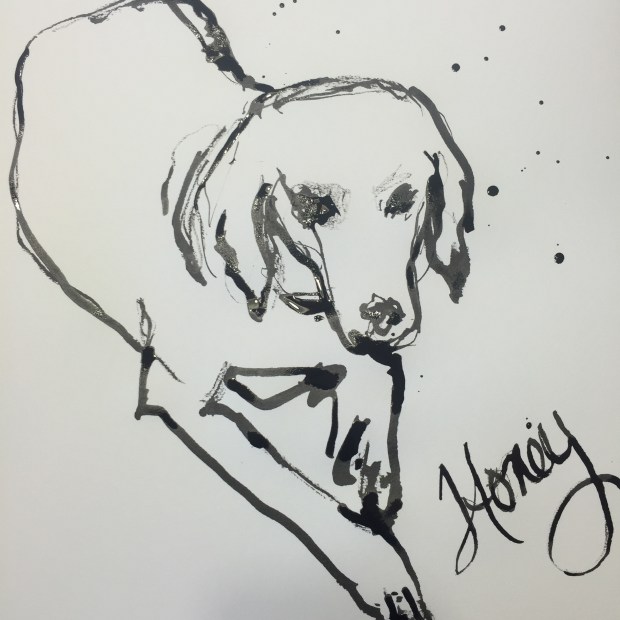 A dog that loves to chase the geese in the neighborhood. My lab Honey begging yesterday. Like the ink drops. They were a happy accident. One fell and I added the rest. She started a little off but improved. Definitely the way she sits on the floor begging.