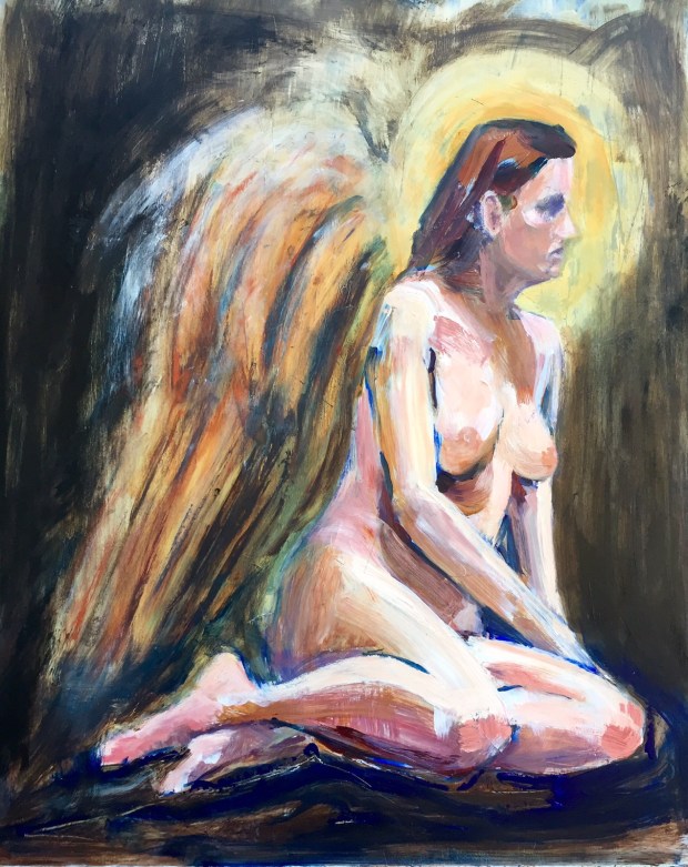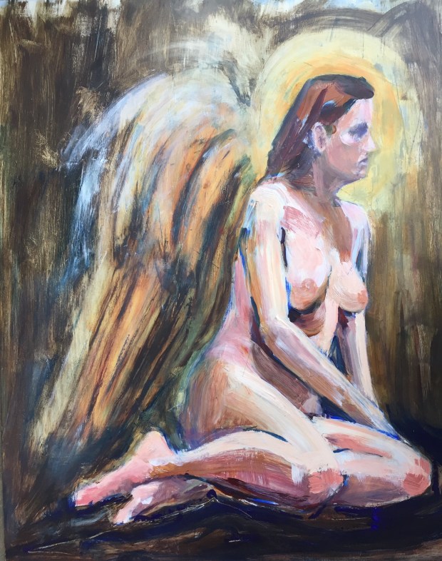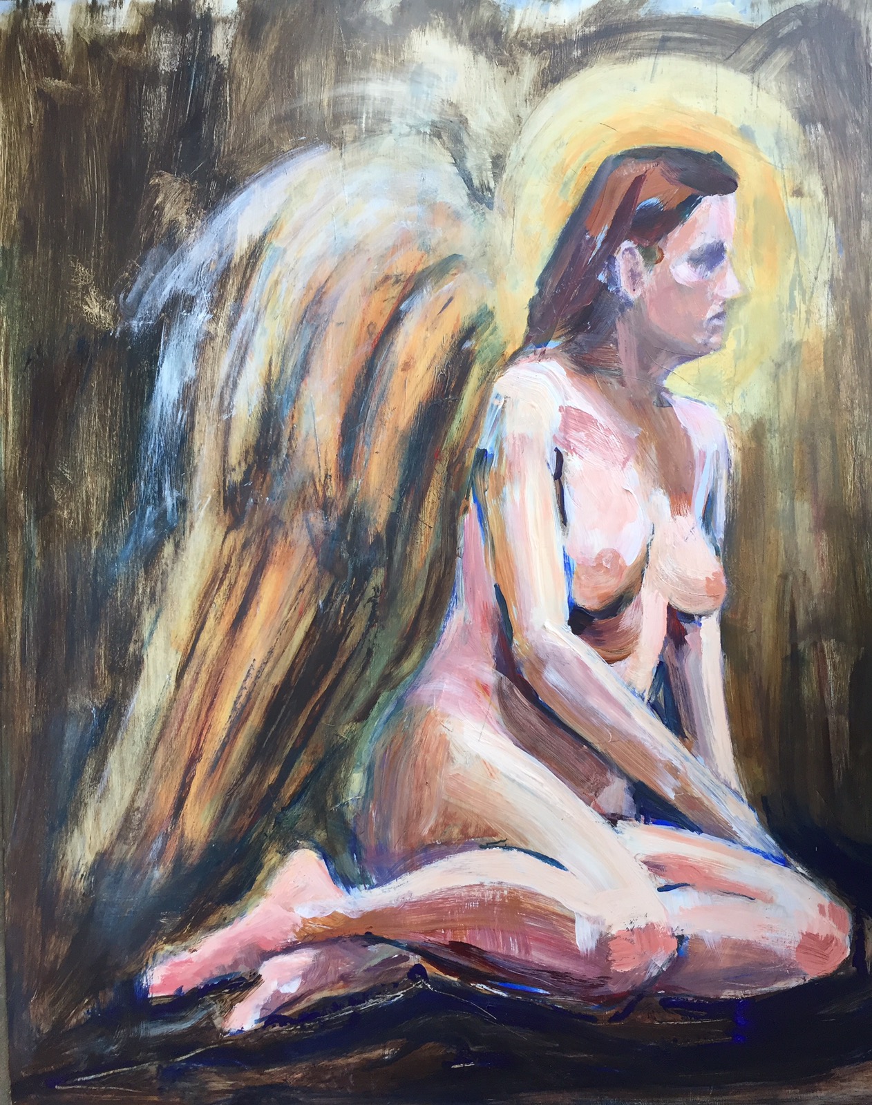 I painted the background a mix of nickel Azo pyrrole red and ultramarine blue and sometimes white. And I rubbed it off around the halo and wing exposing the Titan buff undercoat.