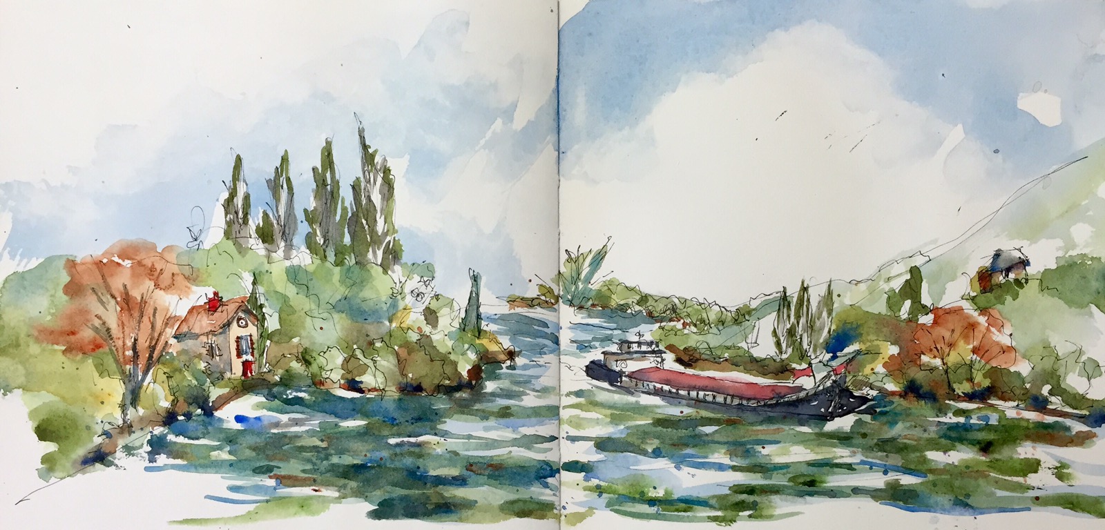 One of the barges that haul anything that ships on the river. I was so surprised at the speed they cruised by us. I barely had time to draw it.