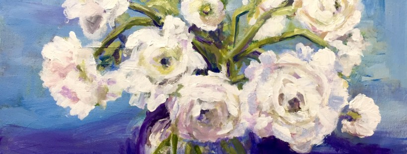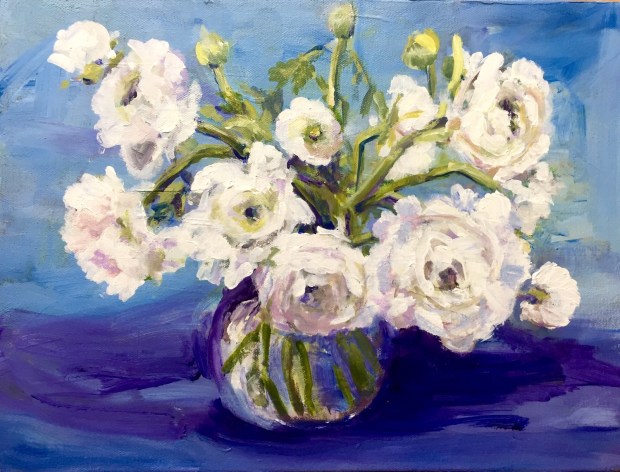 Recently bought some gorgeous white ranunculus at Costco and had to hurry up and paint them before they died. They started dropping and dripping petals the morning after I finished them.