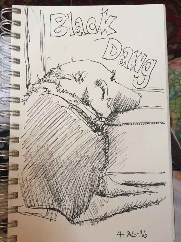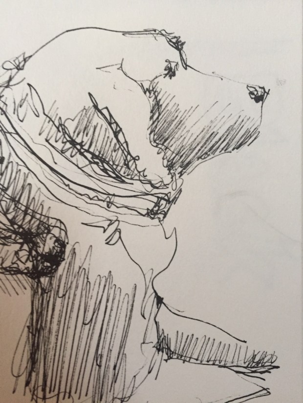 Since I have been sick I have sat in the living room a lot more. My dog honey is much more visible there so she’s getting drawn. She hangs out in the window or sprawls on the rug.