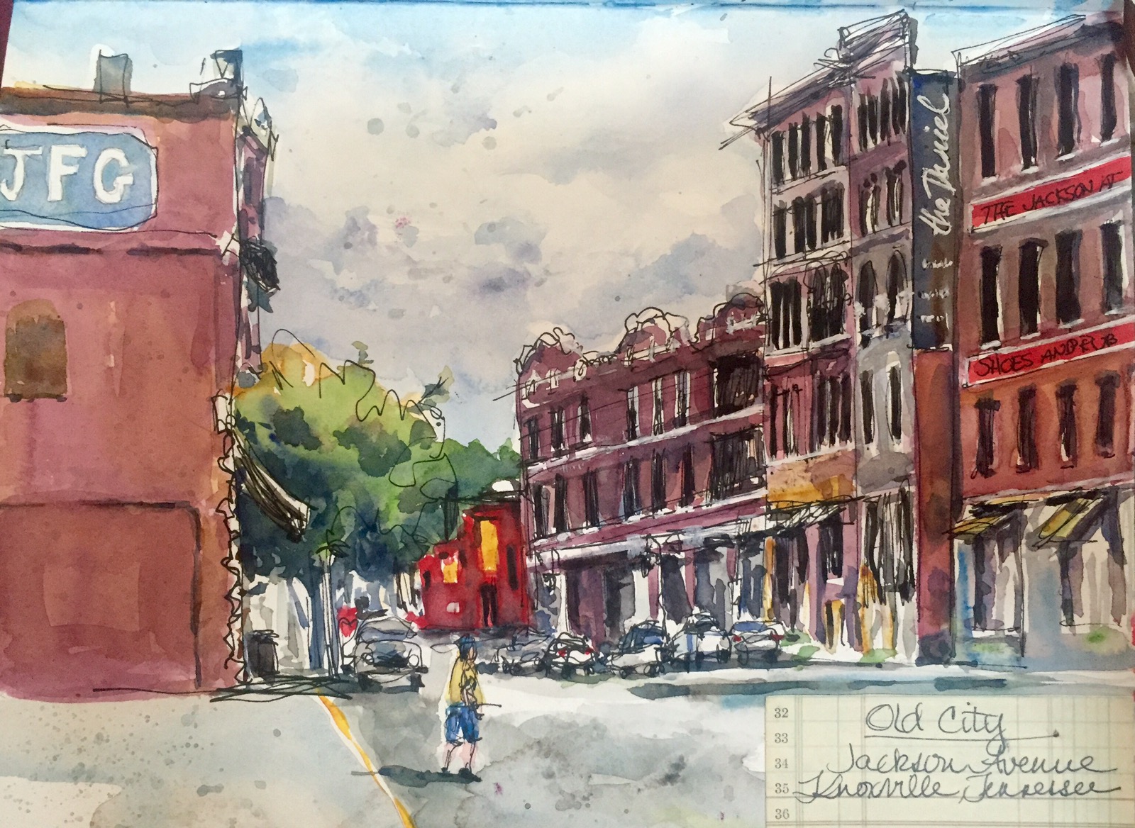 I drew this the first day of class during lunch. It’s the Old Knoxville Business District around the corner from our classroom door on an alley that runs parallel to S Gay Street, Knoxville’s main Street.