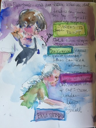 Linda and another ponderer, I never knew her name. LInda was the class teachers assistant all week and volunteered to work diligently to assist John doing whatever he needed to be done. She sold giclees. She tutored people in the use of the atomizer and supervised it’s use. She took photos of all of us with our abstract.