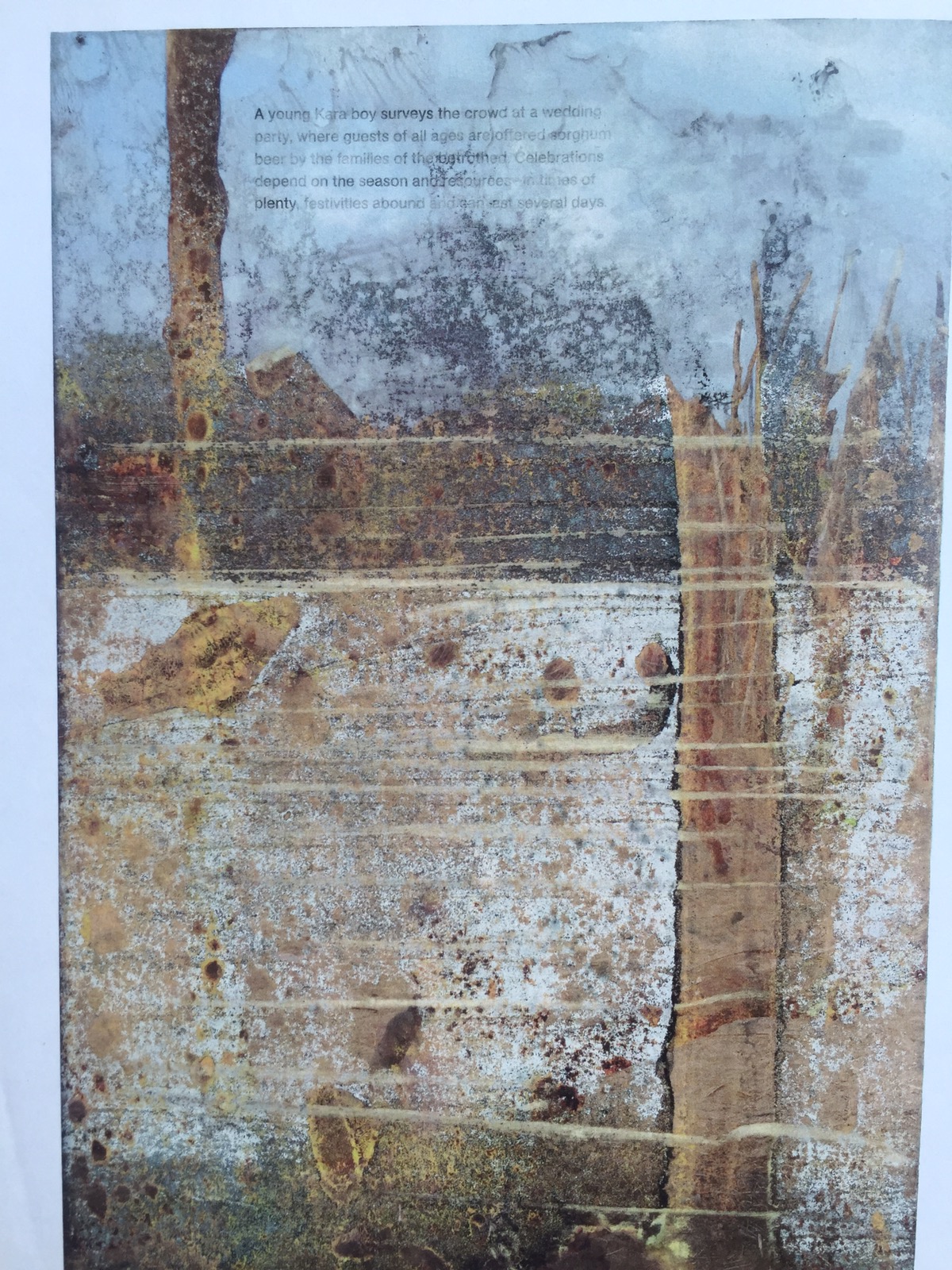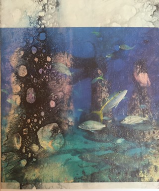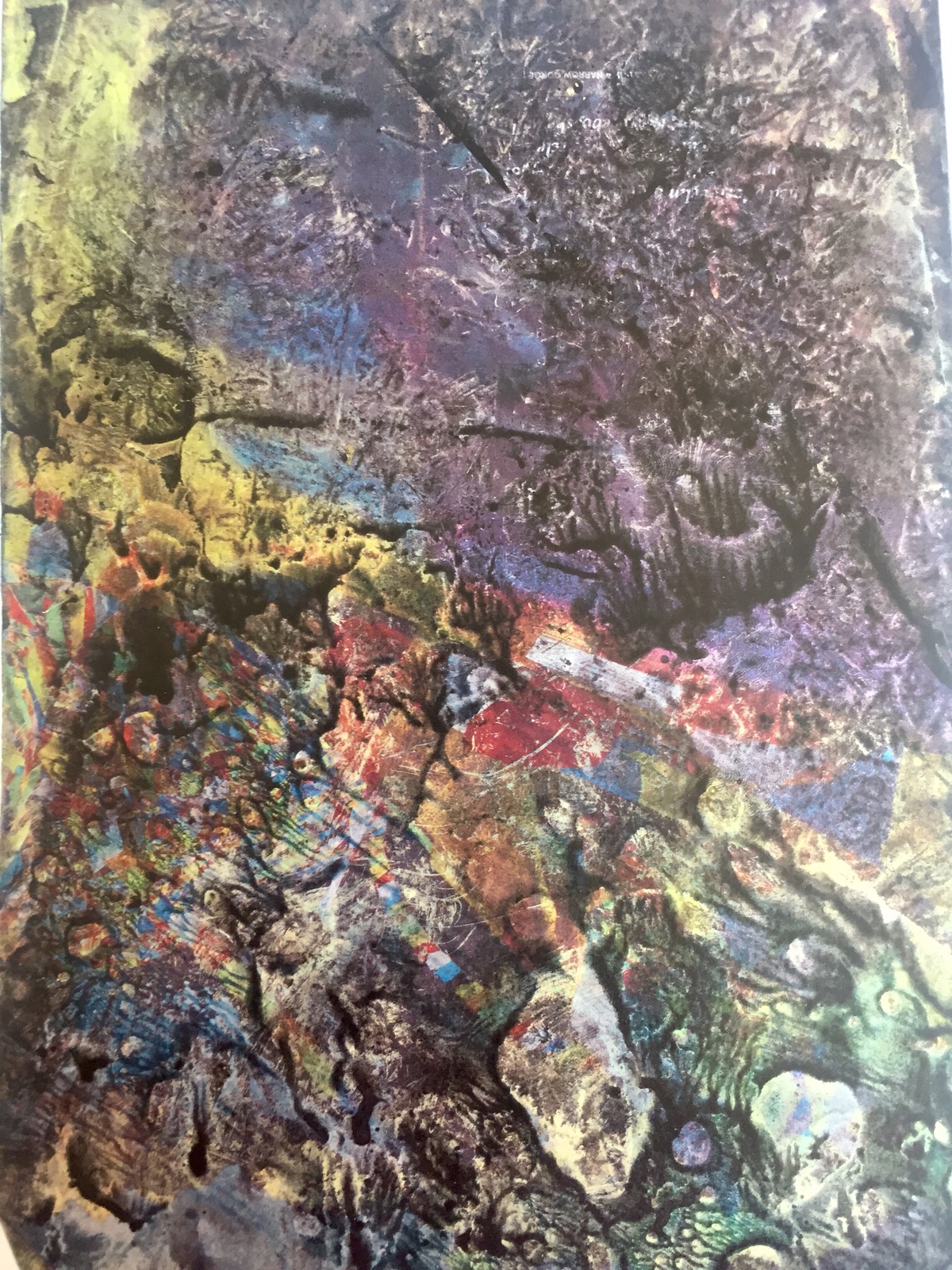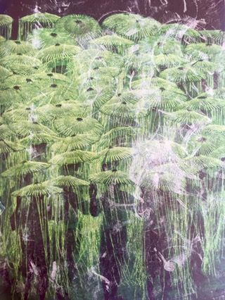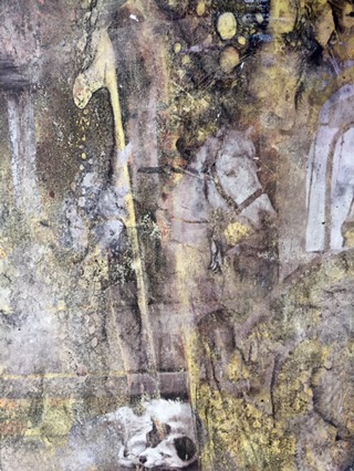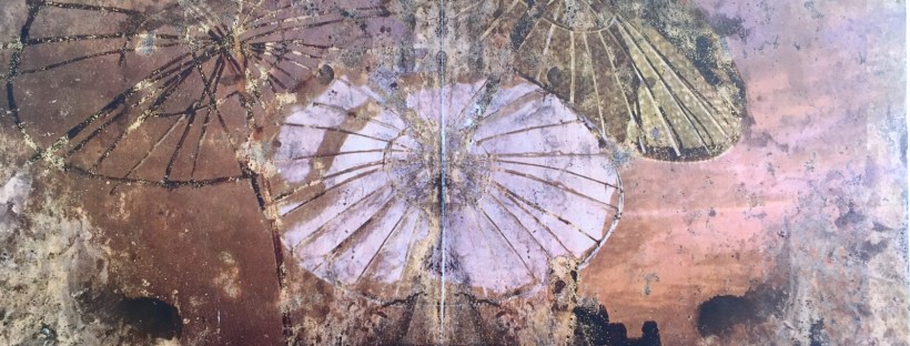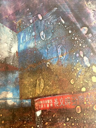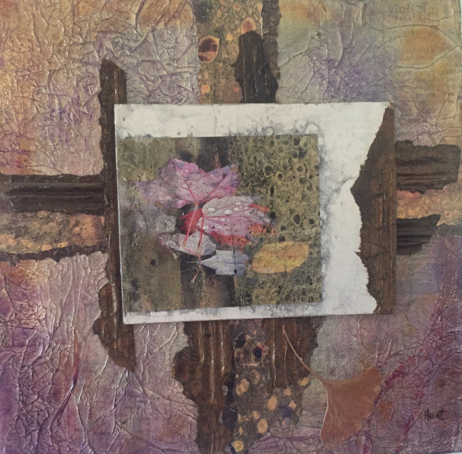 Multimedia collage with citrasolv papers, ginkgo leaves, tissue paper and tuna fish pak cardboard from Krogers.