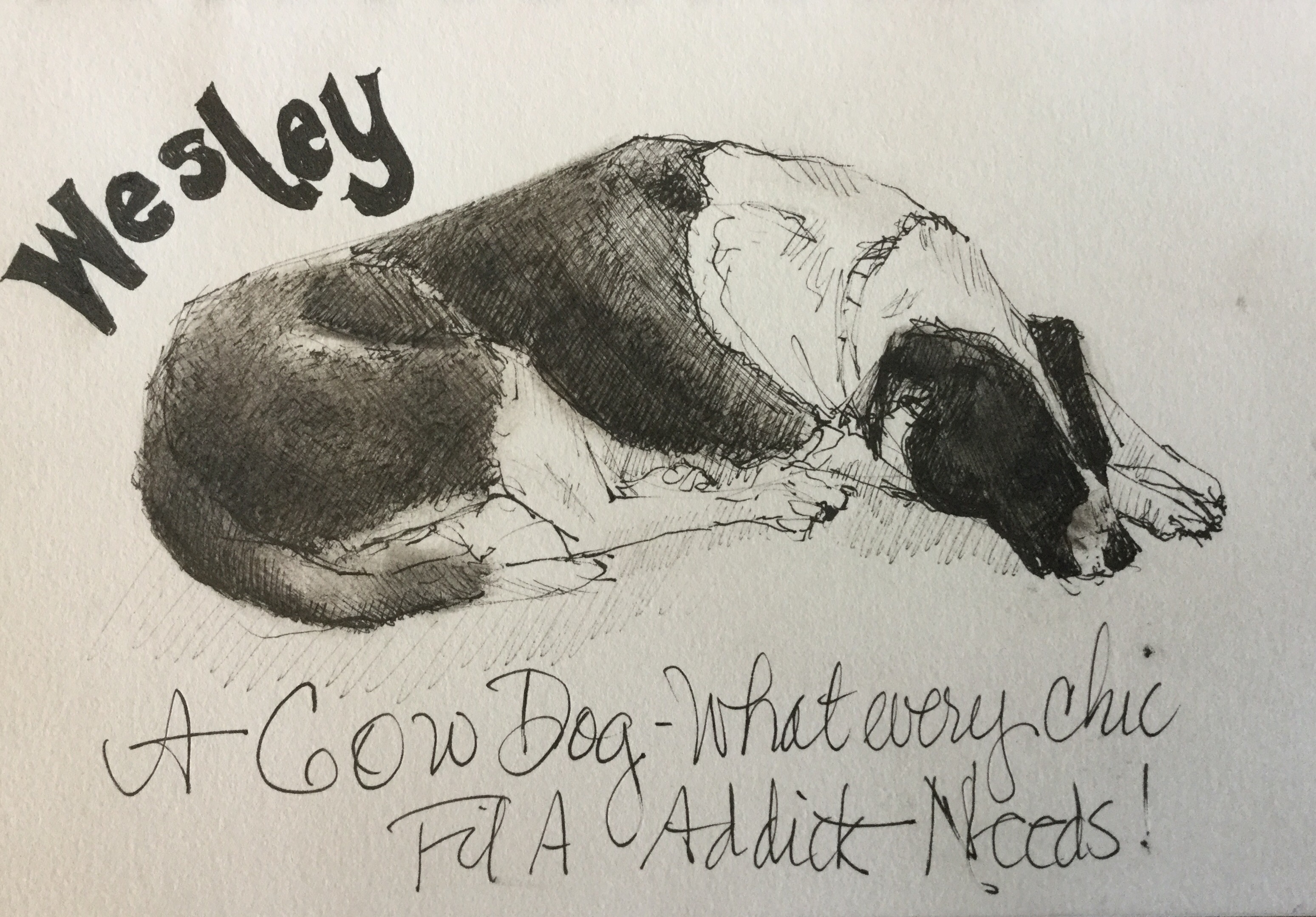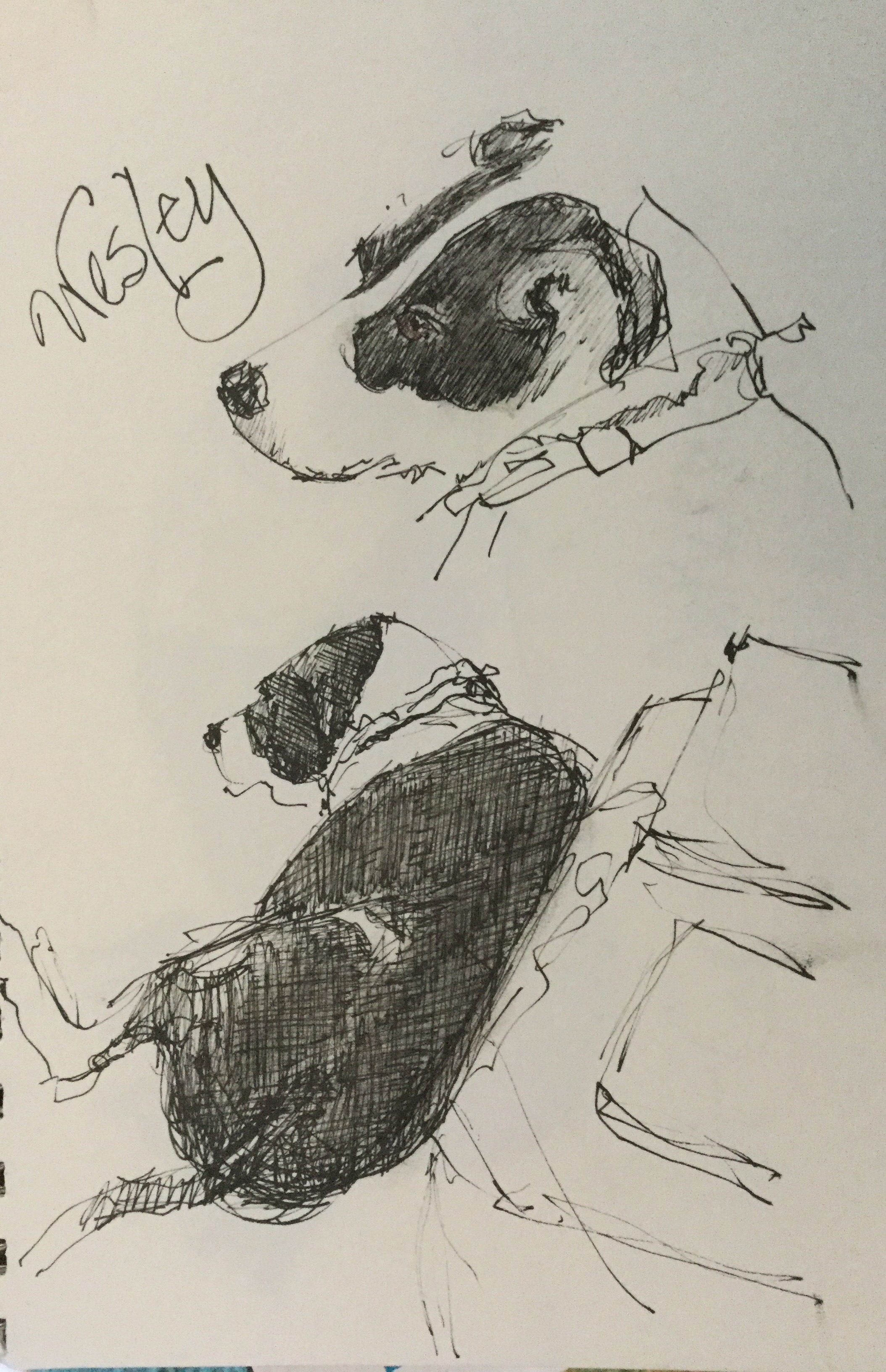 I should be painting something new to post. Goodness knows my sketch books are full of ink sketches begging to be painted BUT there’s a new dog in town. I am babysitting my sons rescue the sweet Wesley aka Cowdog because he’s black and white like the Chic Fil A cows.
