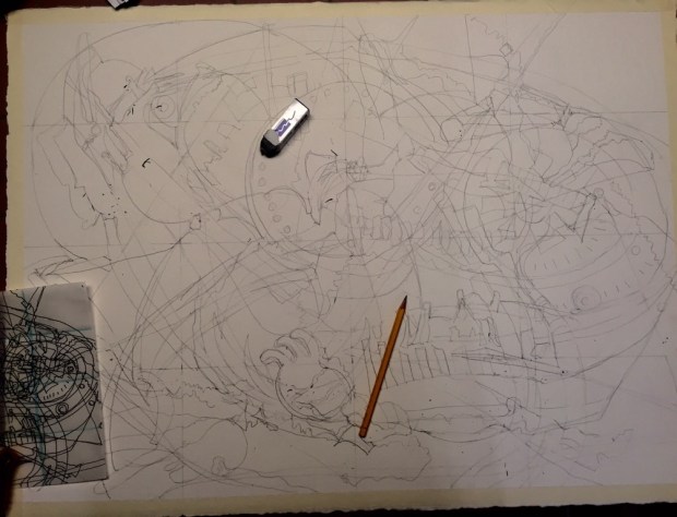 Grided and transferred to a full sheet of arches 300# cold press. The edges were taped off with narrow masking tape.