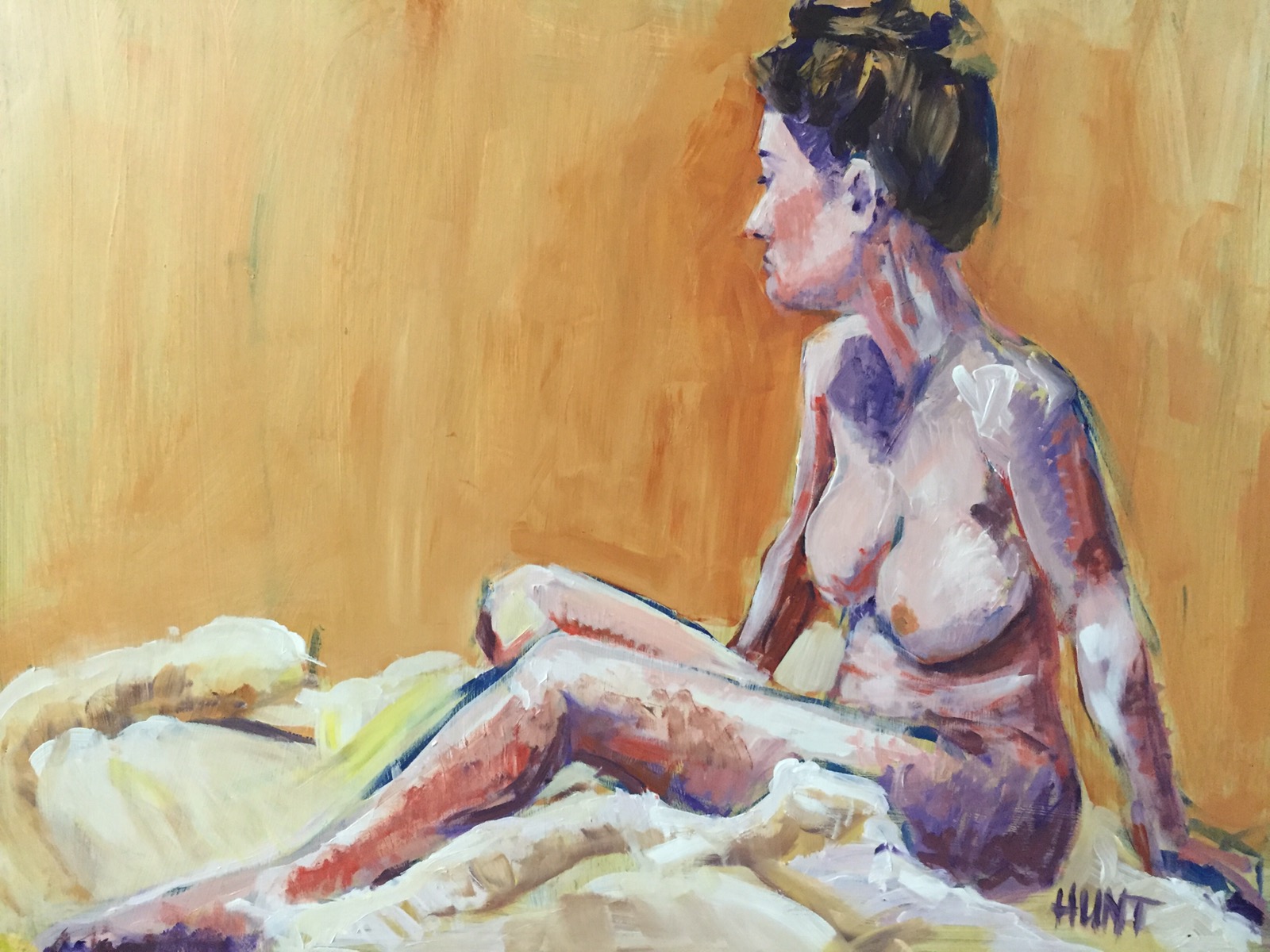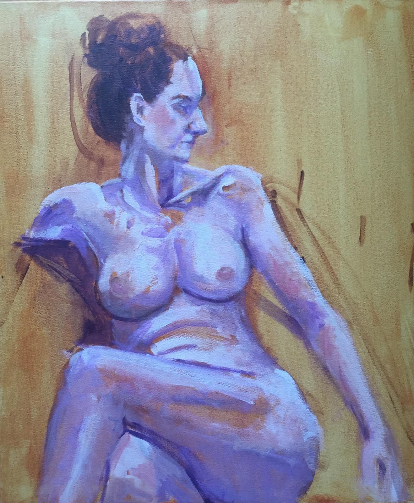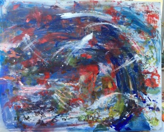 The background was just too busy and competing with the expressionistic figure. I smeared a piece of board with bits of leftover paint on my palette sheet every week for a while.