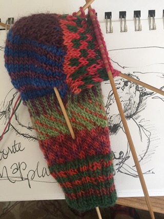 Back to my grandsons socks. He tried to make a net out of my scraps. Then I figured out he was trying to knit and saying net. When I figured out what he meant he told me the colors and gave me the yarn he wanted and then ran back to add rainbow socks. He’s four. I laffed a lot.