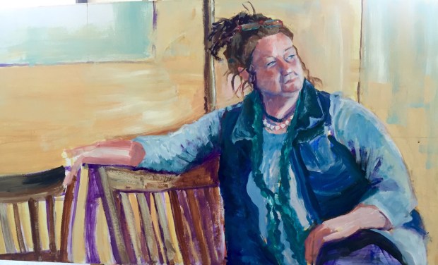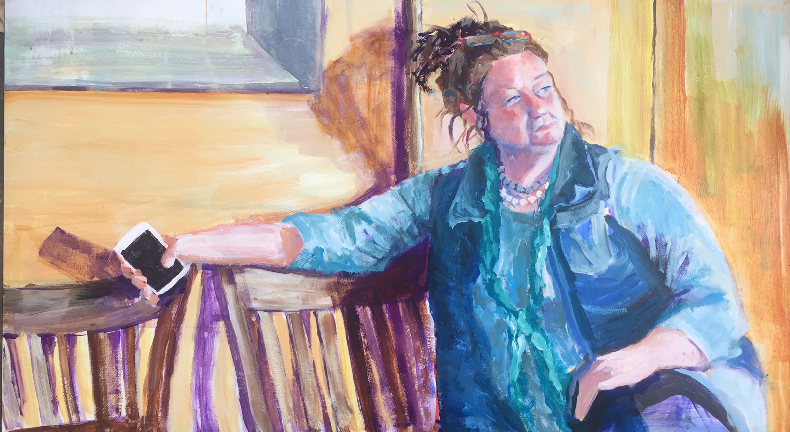 Work continues. Or should I say progresses. I added the shadow which is a mix of Winsor purple and Nickel Azo gold. The gold is very transparent. I also added the left hand and the phone. More shadows on the chair. Worked on the background some.