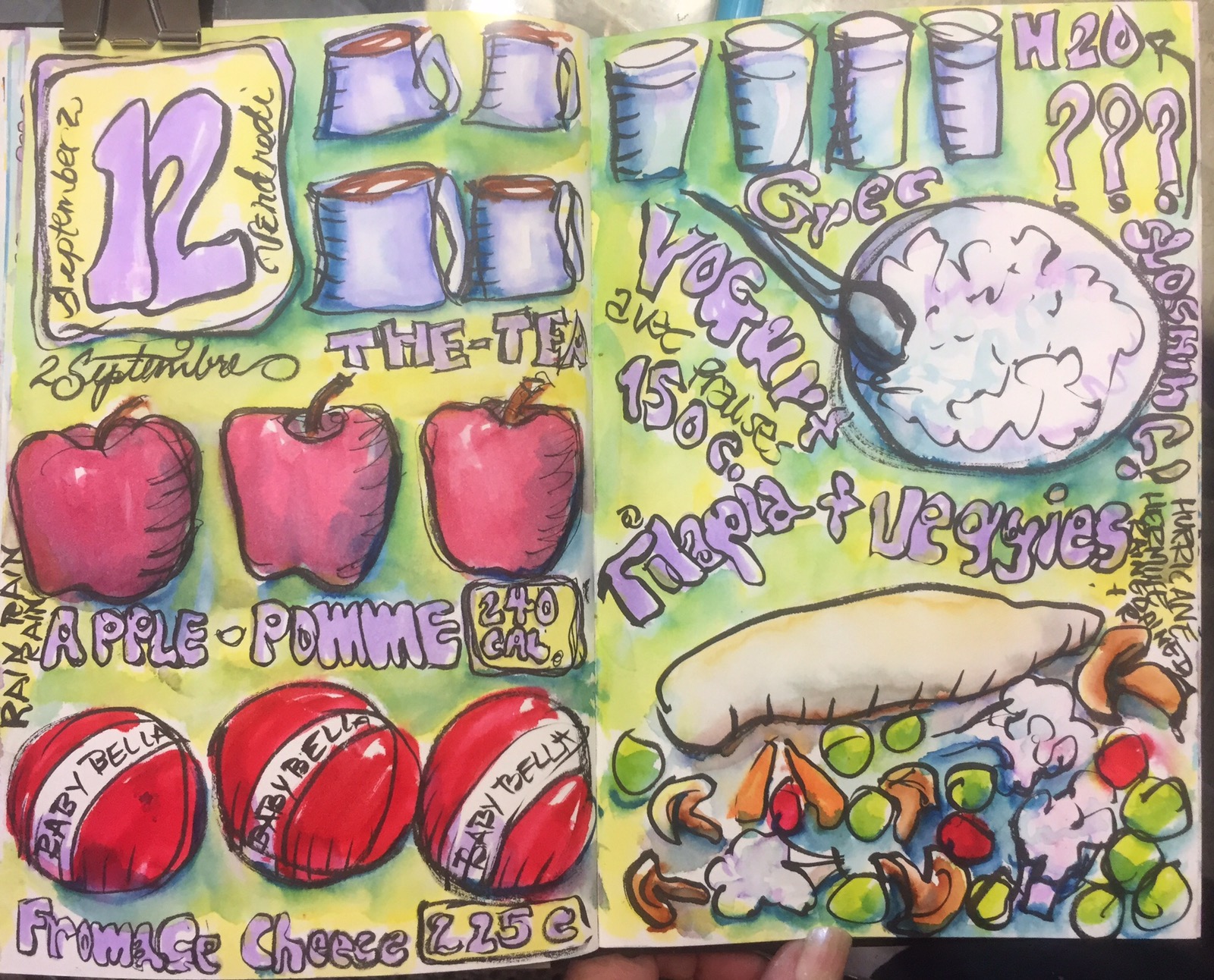 Another journal page. I am actually on day 17 and all the previous days are done.  Usually I draw them as I eat and then color in my coloring book when I have time.
