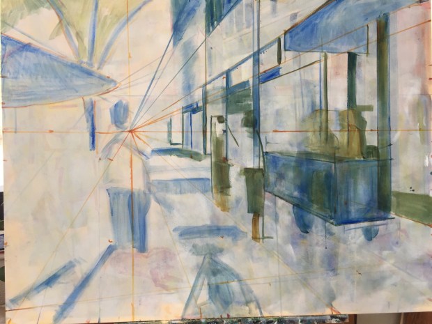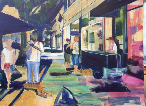 Been putting in the darks in this big acrylic of Tenth and Broad Street in downtown Augusta. I should have taken another pic because all that green in the middle is gone now.