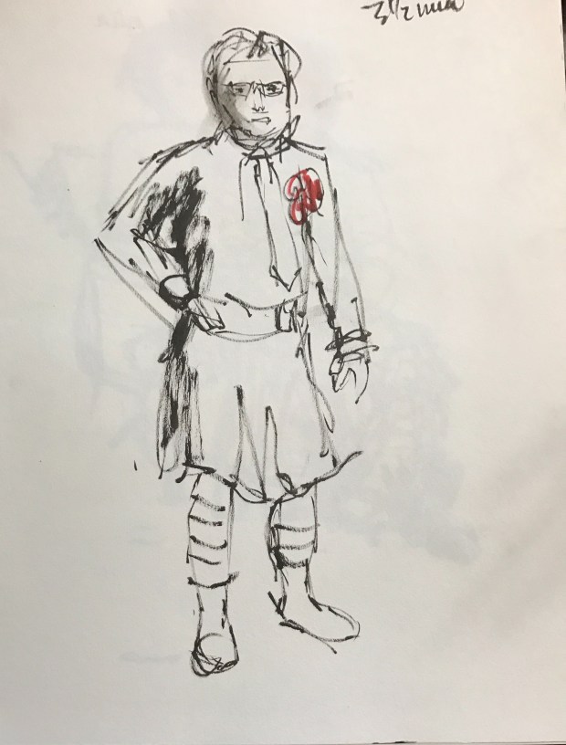I set the angle on his head first. As I draw I am always looking at angles and negative shapes. Also dropping plumb lines from say a shoulder to the knee to get bod parts where they Belong.