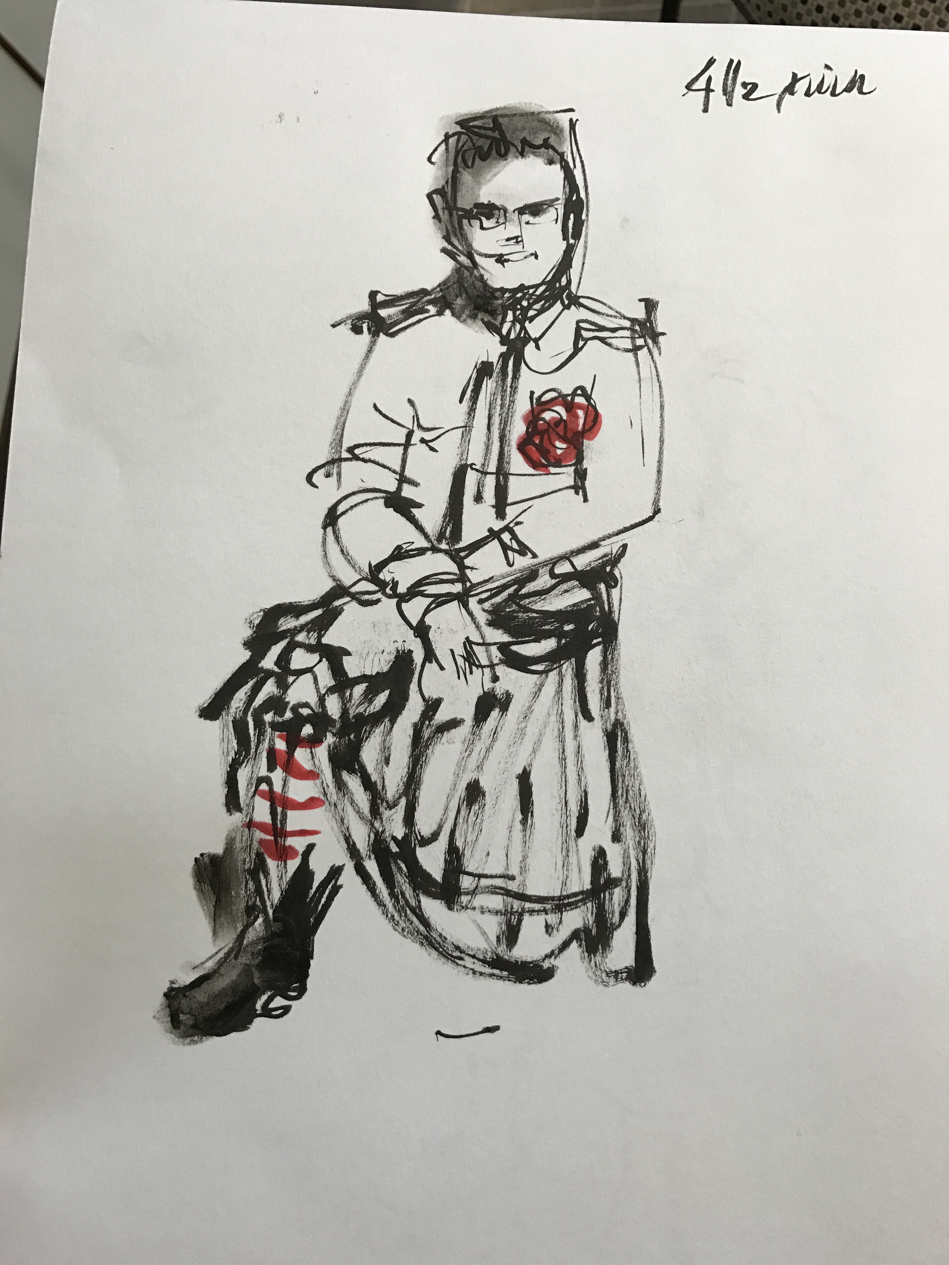 As you can see in the first two sketches above the watercolors with a pentel water brush were the answer. I did not bring even ONE good sable brush. Eek! But Dr Sketchys is partly the fine art of making do. And I did with good results.