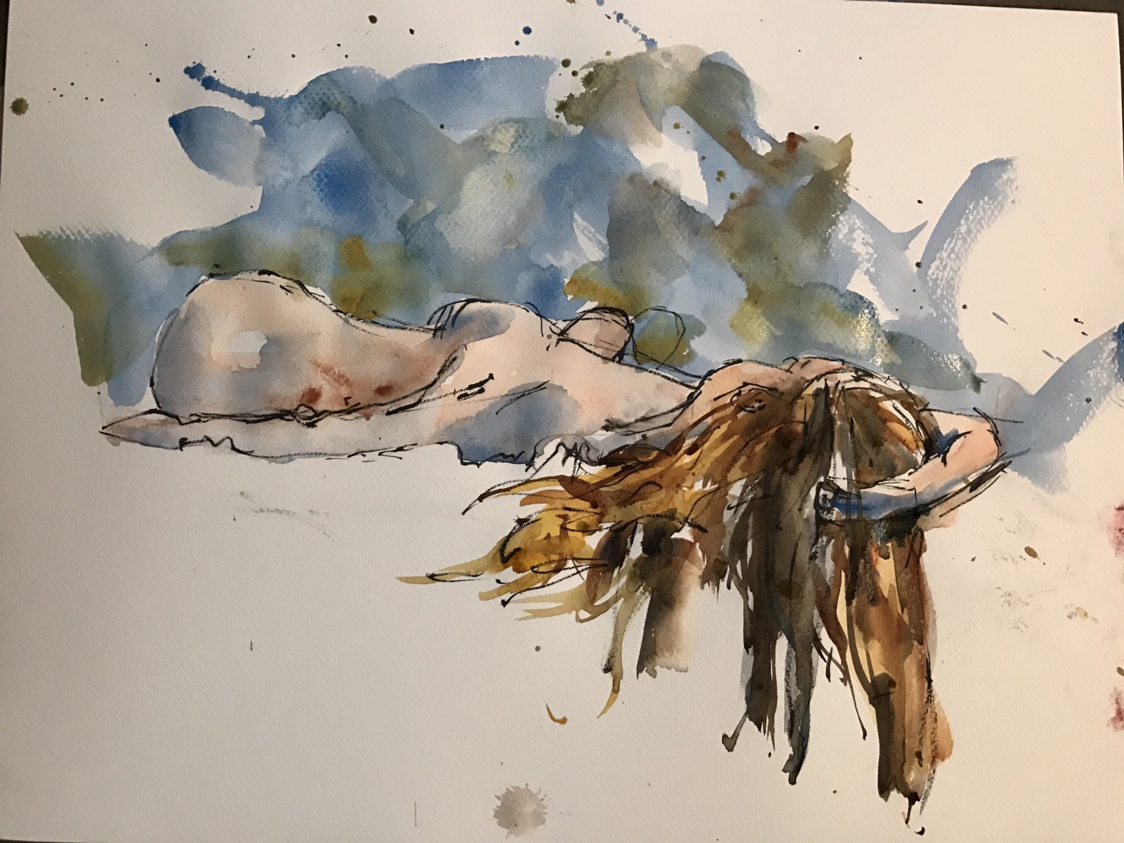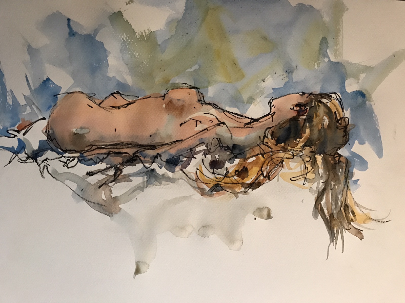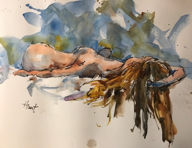 Sarah 20 minute warm up sketch 12×16 Canson mi-teintes paper pentel brush pen and watercolor.  Really like this one a lot. Instead doing one large acrylic painting today I decided to do some pen and ink sketches in watercolor because I had done so well at Dr Sketchys Wednesday nite nailing the proportions over and over.