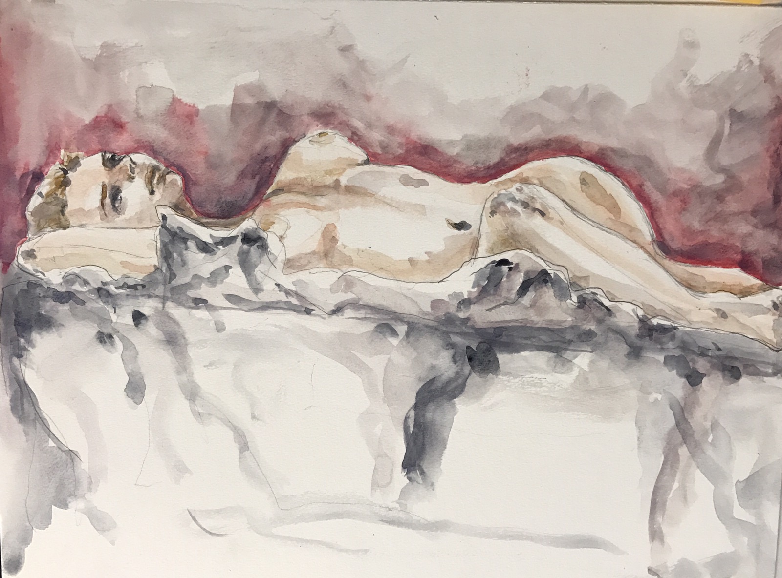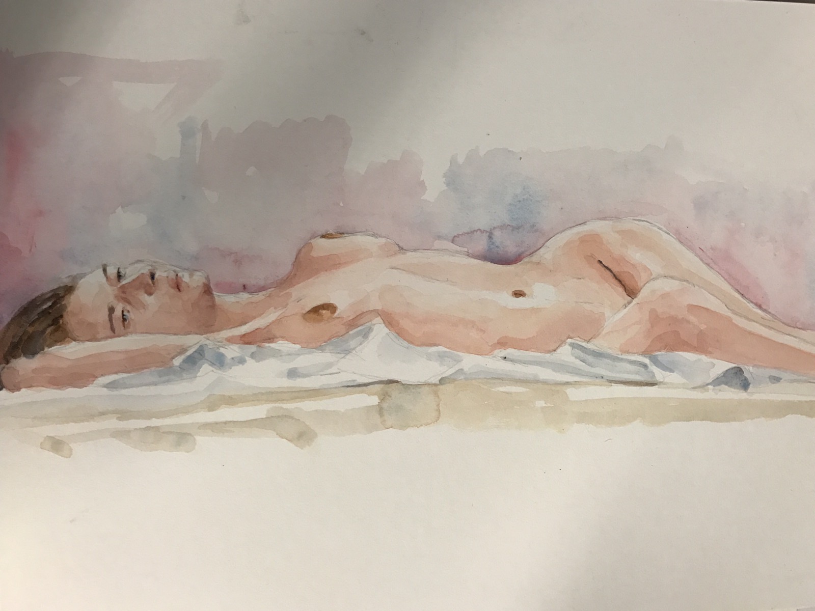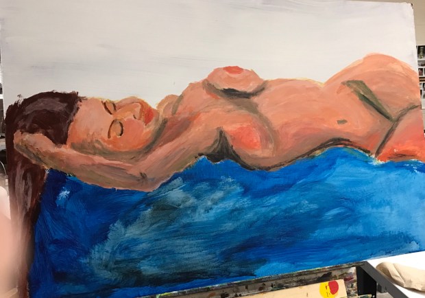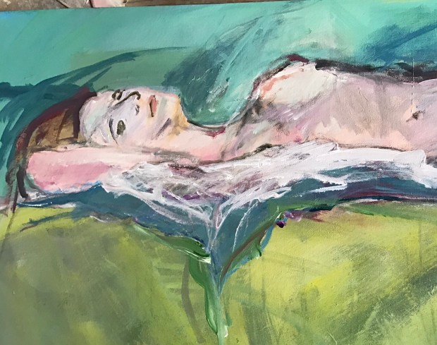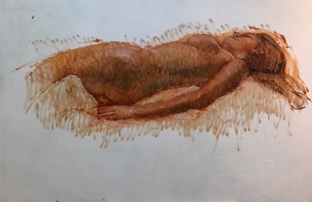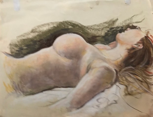 Go round #2 from a slightly different angle. I could actually see her arm. After about thirty minutes. I started over because I mismeasured. The knob to the right of her left breast is a foot or a knee all I could see of them. Ruth said it looked like a growth so I painted it over. Don’t know if I should have stopped while I was ahead but here she is with perhaps another 2o minutes painting.