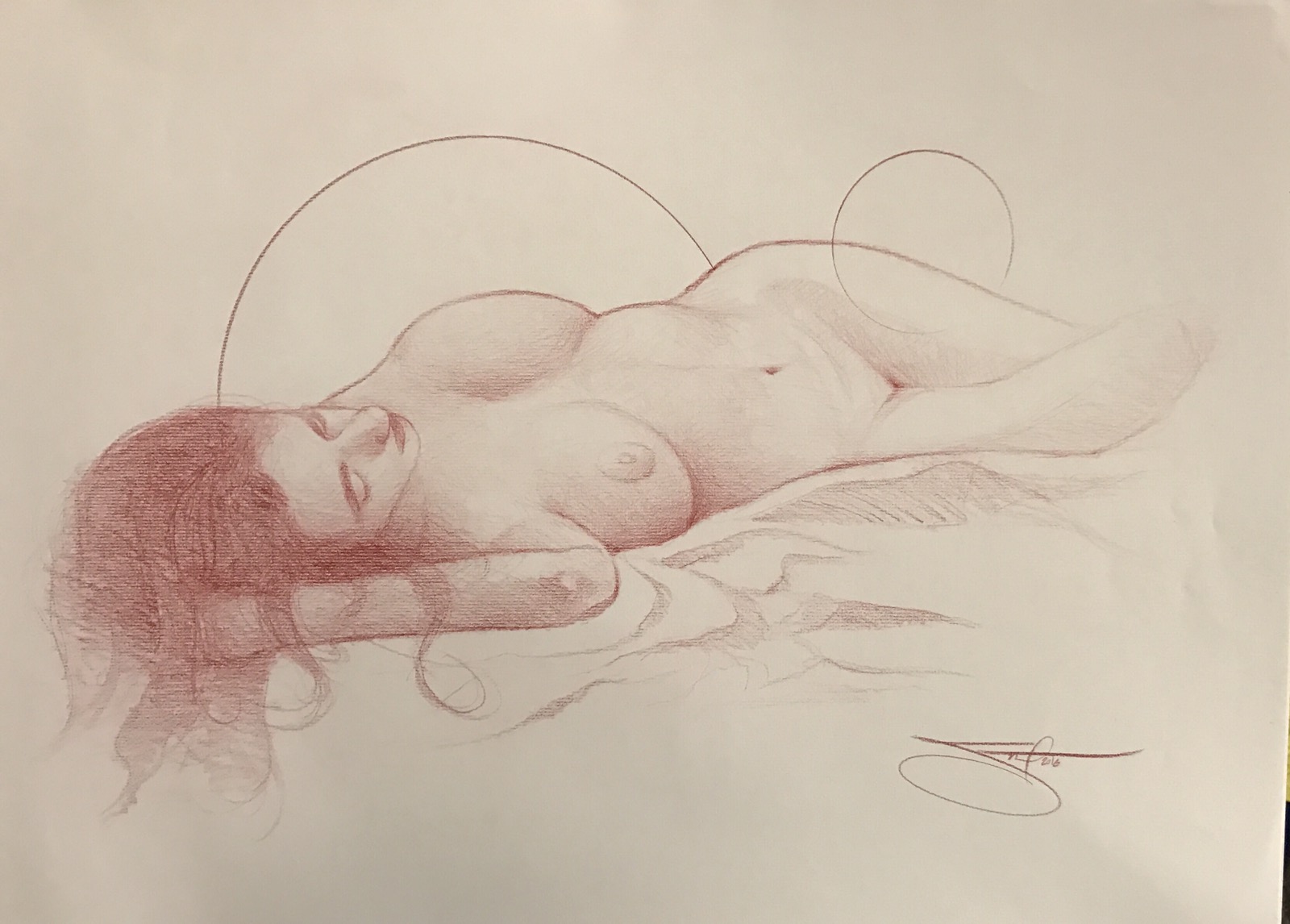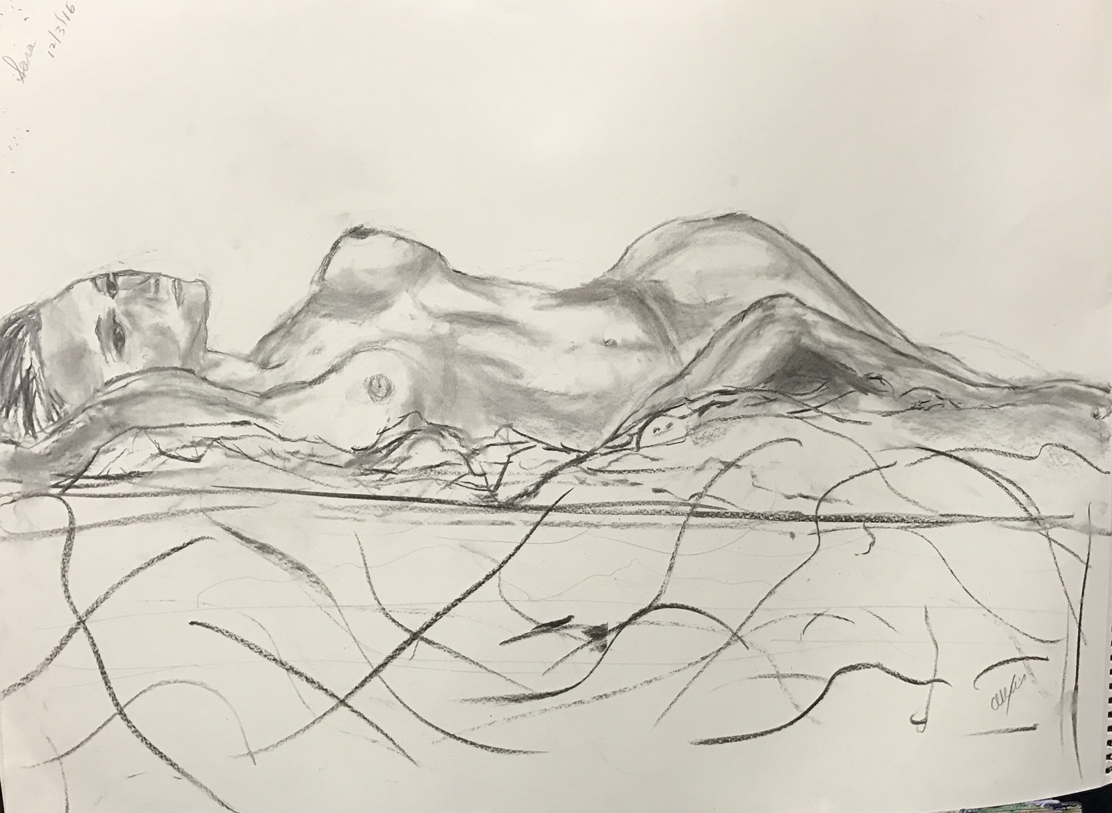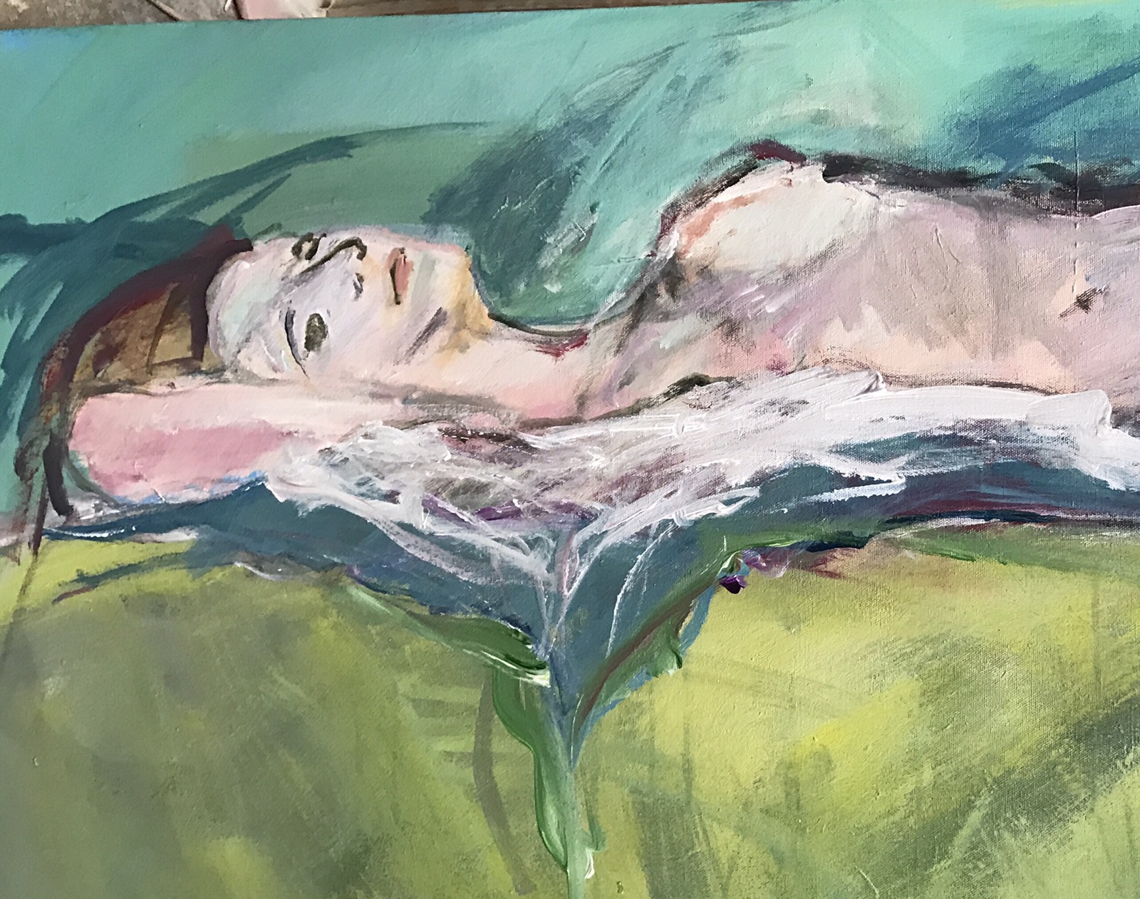 Go round #2 from a slightly different angle. I could actually see her arm. After about thirty minutes. I started over because I mismeasured. The knob to the right of her left breast is a foot or a knee all I could see of them. Ruth said it looked like a growth so I painted it over. Don’t know if I should have stopped while I was ahead but here she is with perhaps another 2o minutes painting.