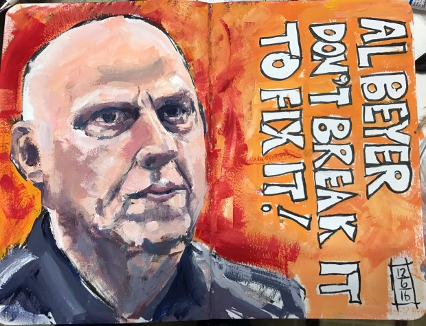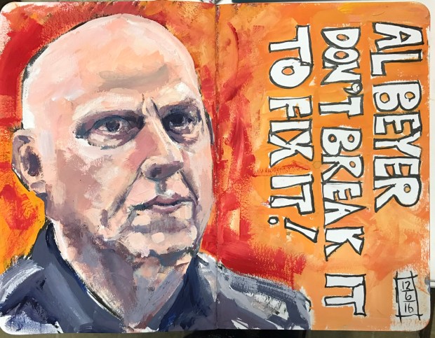 And of course I broke this one. I used gouache partly because Al likes it better than watercolor but also because the sketch was terrible. The face was too fat the eyes were off and at the wrong angle. All the black around it is where I corrected it and colored over the background.