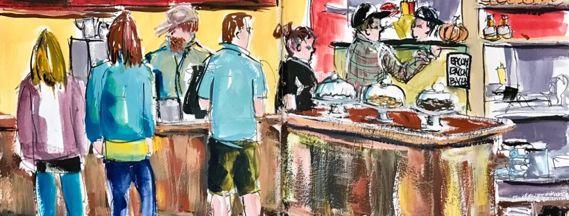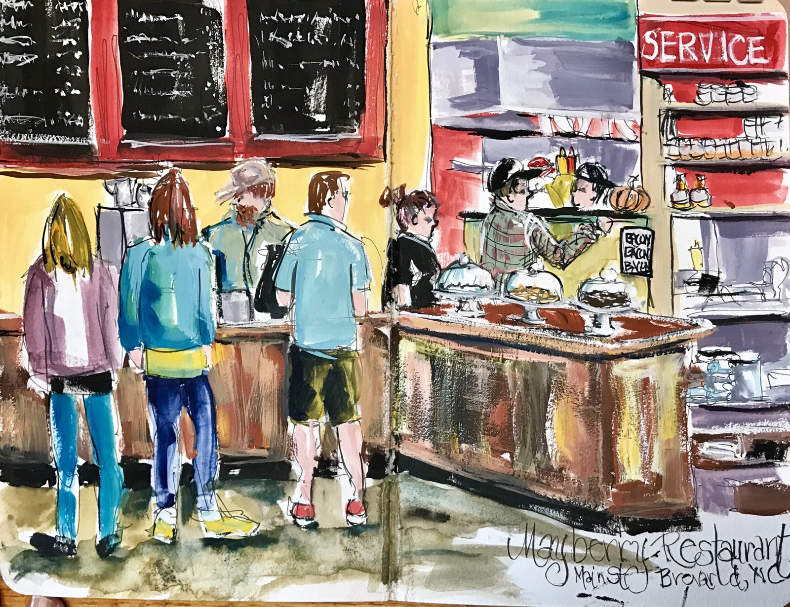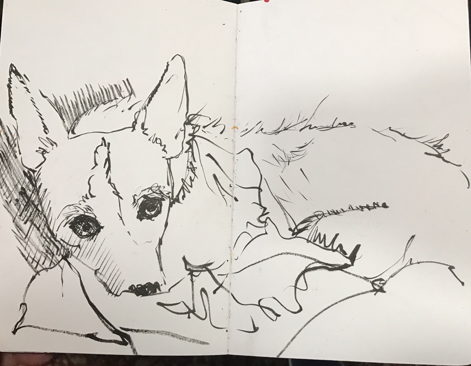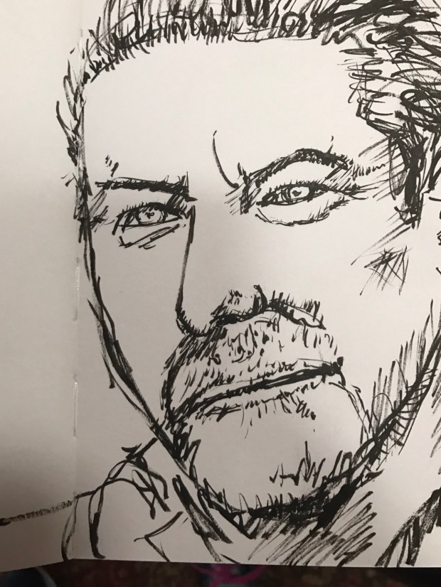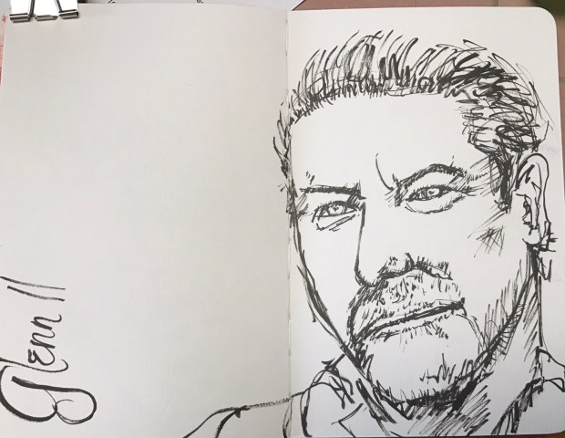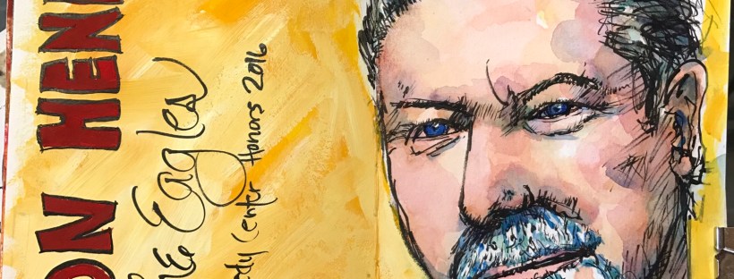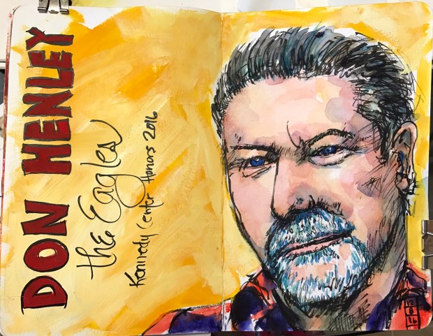 And a big oops. They were talking about band member Glenn Frey on CBS when I was drawing this. My poor brain decided to write his name instead of Dons. Oops. Great G though. So I had to use the gouache to paint it out. It was either that or some ledger pages.