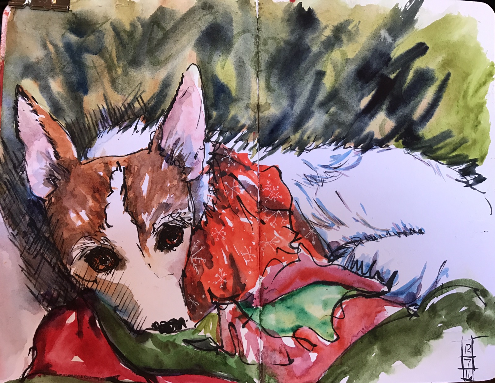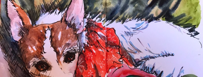 When I drew this she was tucked up on the sofa on a red and green diamond Christmas quilt a perfect foil for her white fur. Her big brown eyes could drill holes in you.