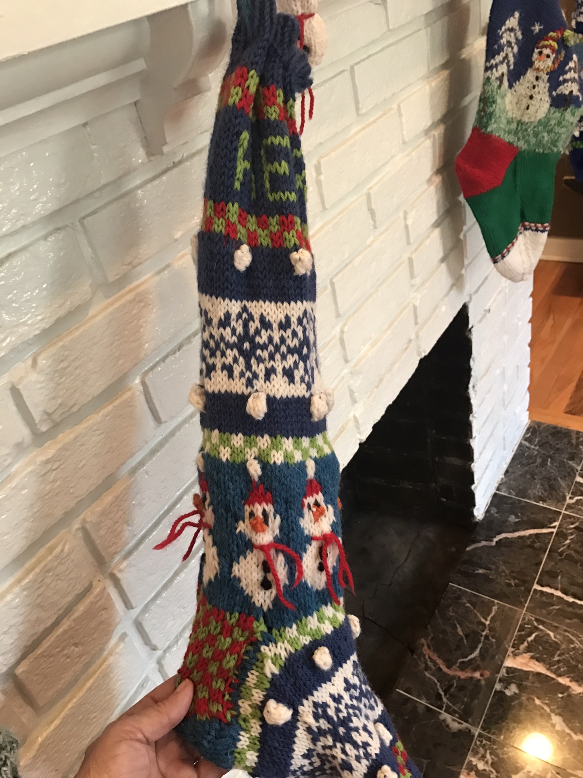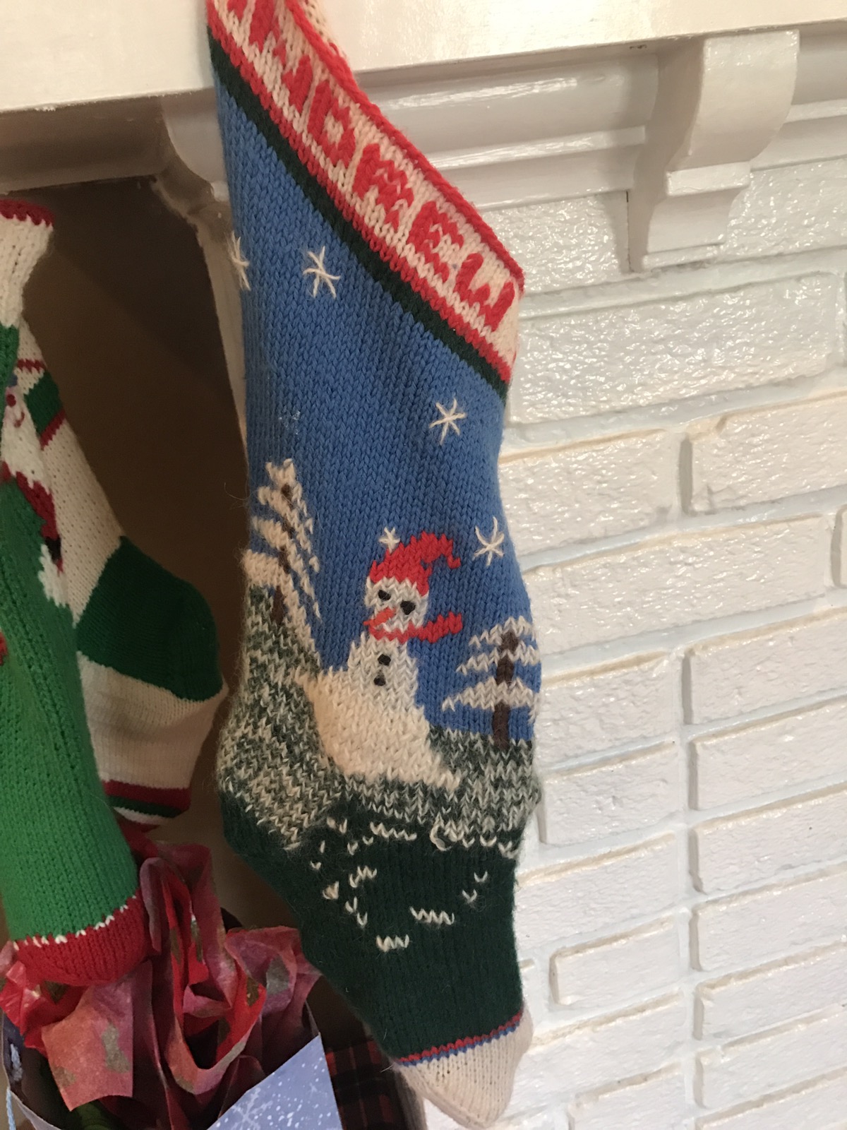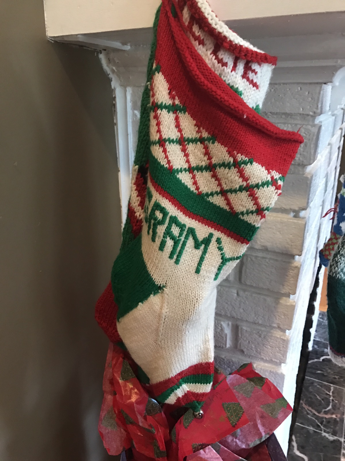 My dad knitted this one for his mom in 1970 or so. Instead of knitting in the letters he actually whip stitched them on. A quirky fun effect. Now it’s my stocking.