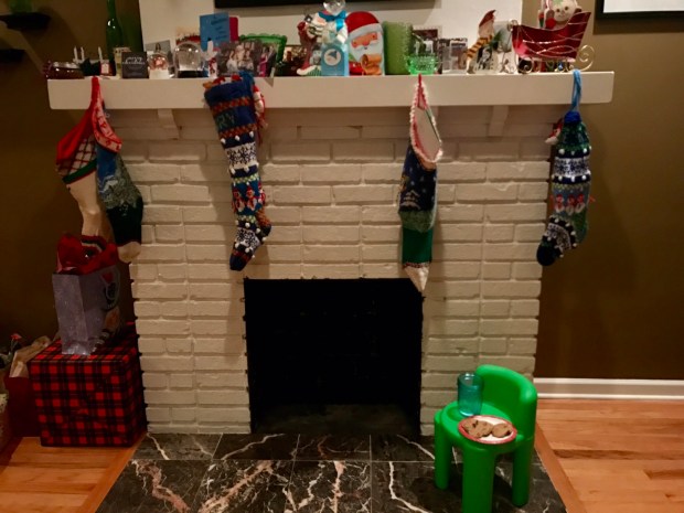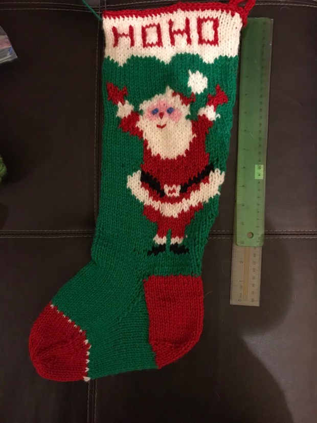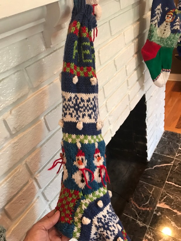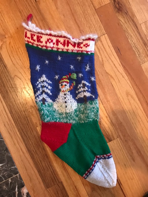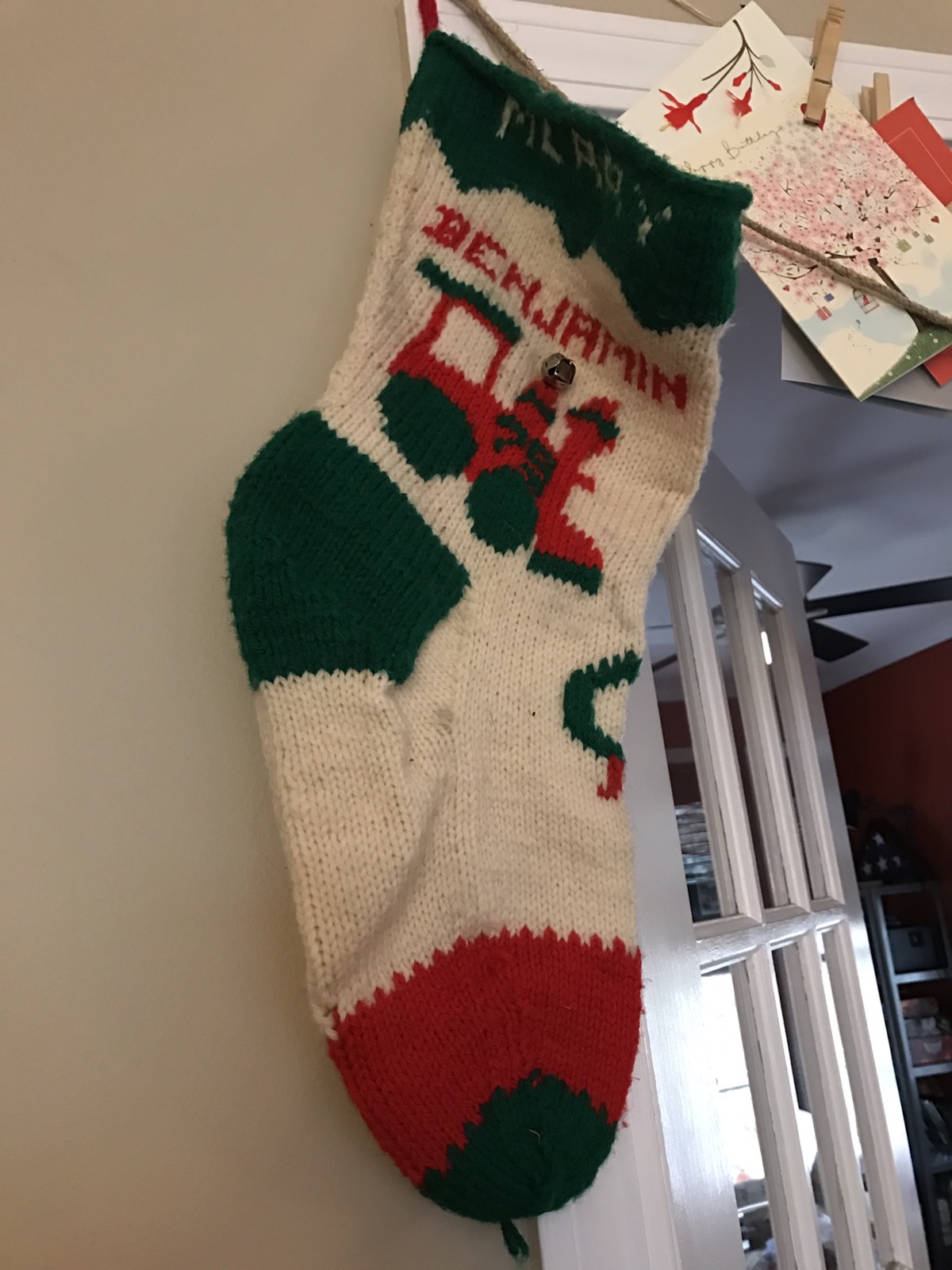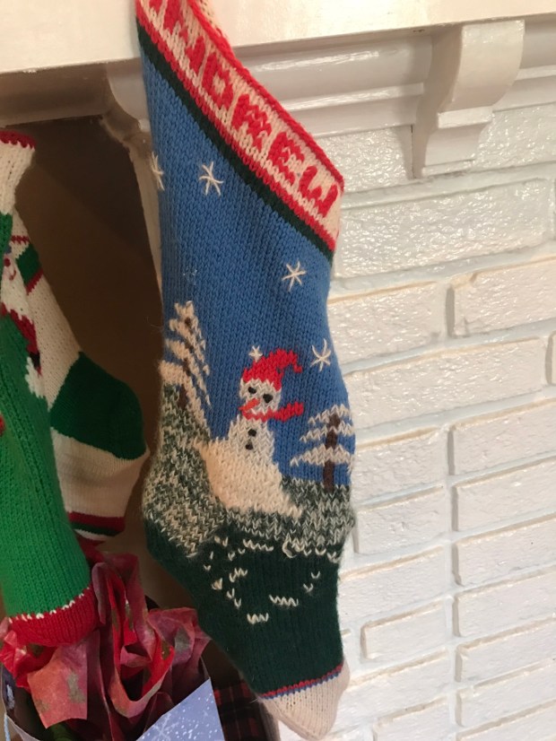 My dad knitted this one for his mom in 1970 or so. Instead of knitting in the letters he actually whip stitched them on. A quirky fun effect. Now it’s my stocking.