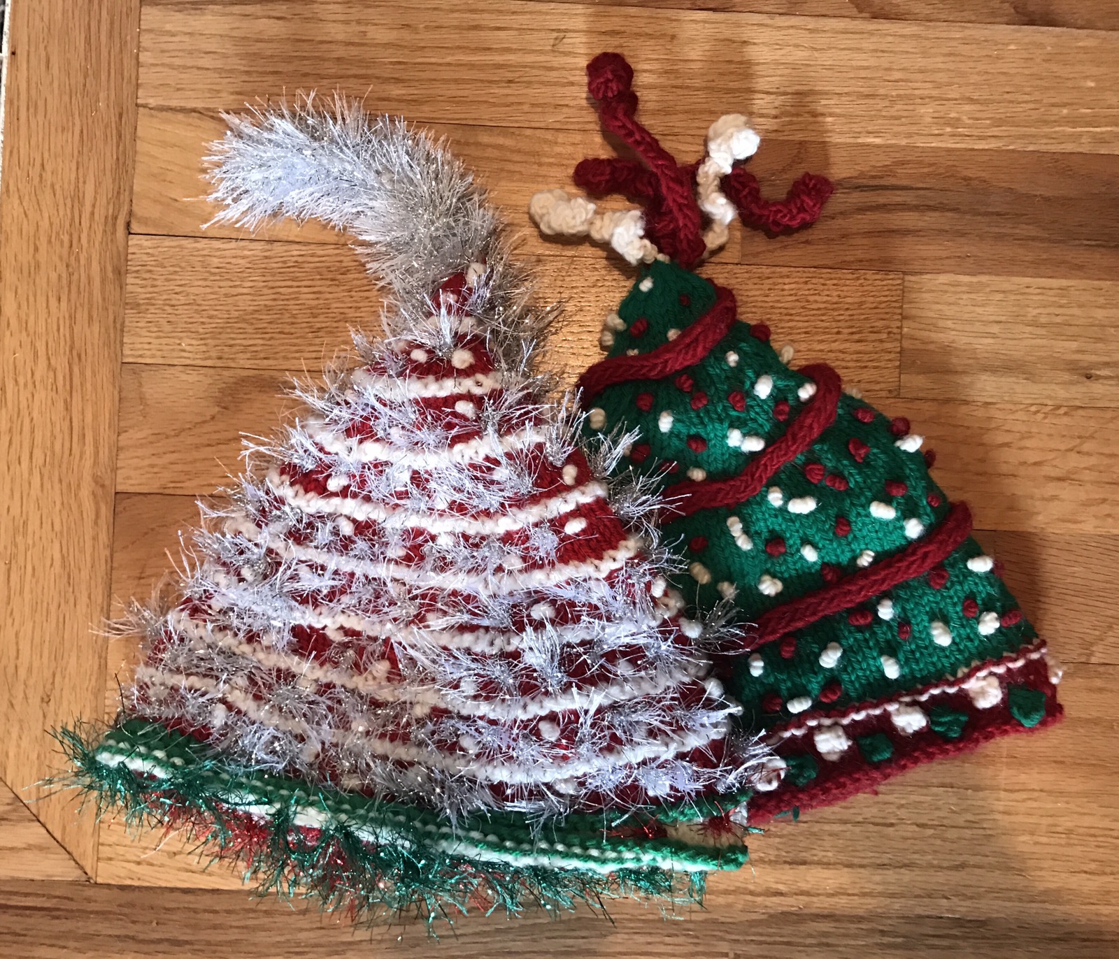 These Christmas hats are a big hit and very easy to knit. Just a regular knitted cap decreased at the top to a point. The green one is decorated with icord.
