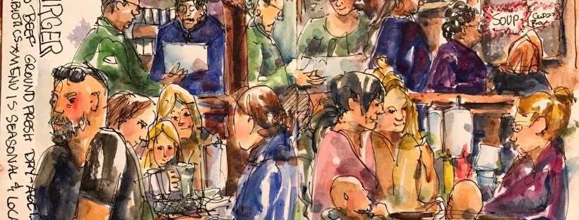 Are at Farmburgers in Decatur. Locally grown food to table restaurant on Ponce de Leon. I drew this with my Lamy Safari during g the end of rush hour.