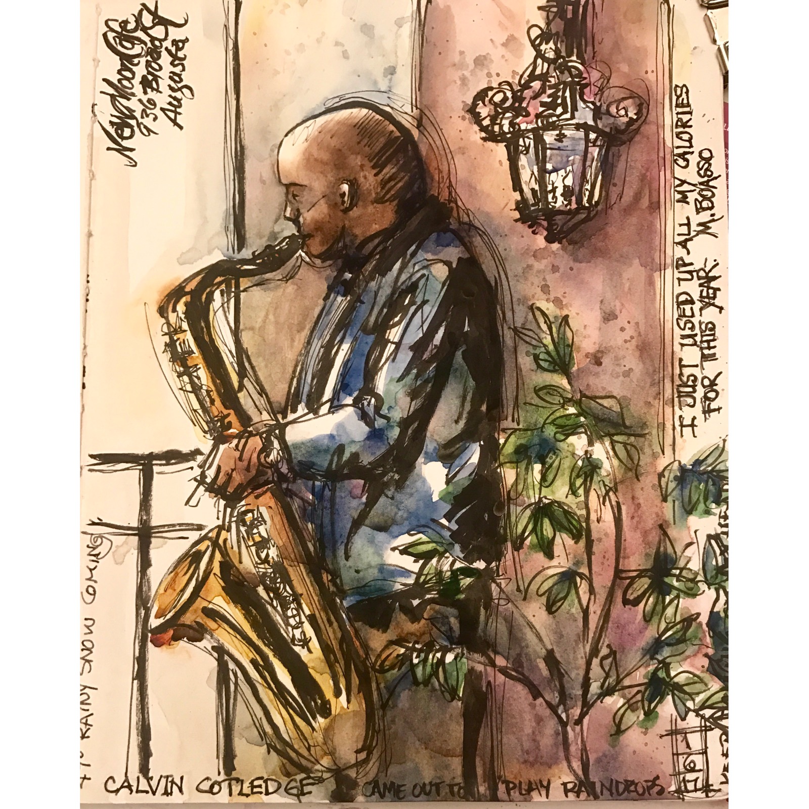 Gouache to the rescue. Almost like using acrylics. The background is watercolor. Peacock blue and hematite green. Then I scratched the wc off the palm tree.