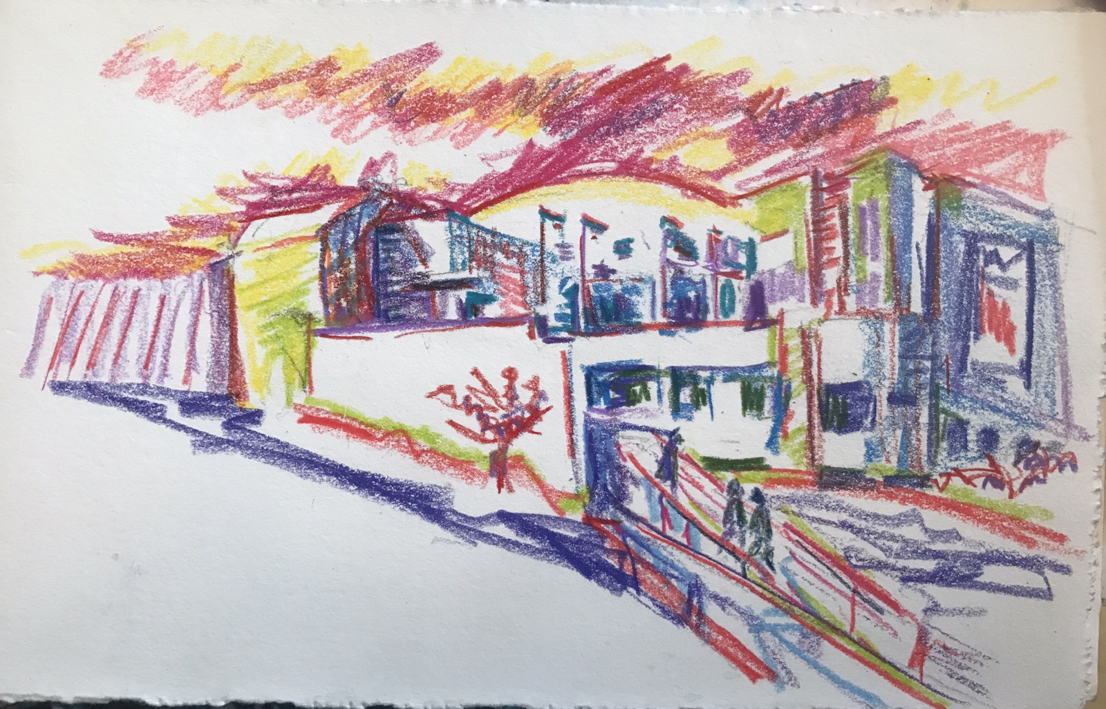 The High Museum 5×8″hmm this building is all white but not in my version. Added the red sky to hopefully make building pop. And dabs of lime green to make the red pop or was it the other way around. Complimentary colors do that.