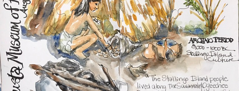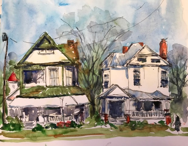 I added the guy walking by. He’s really just an oval, a rounded triangle for the body, and a couple of strokes for legs and feet. Ditto for the arm.