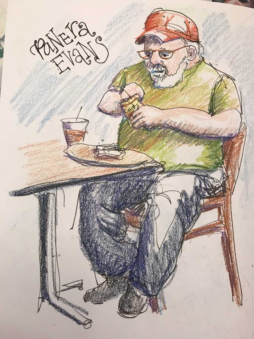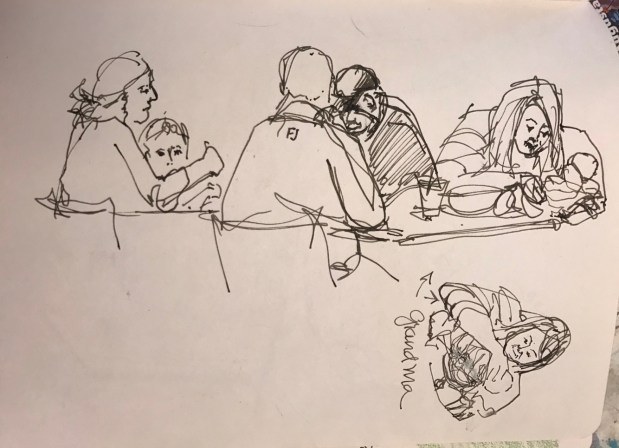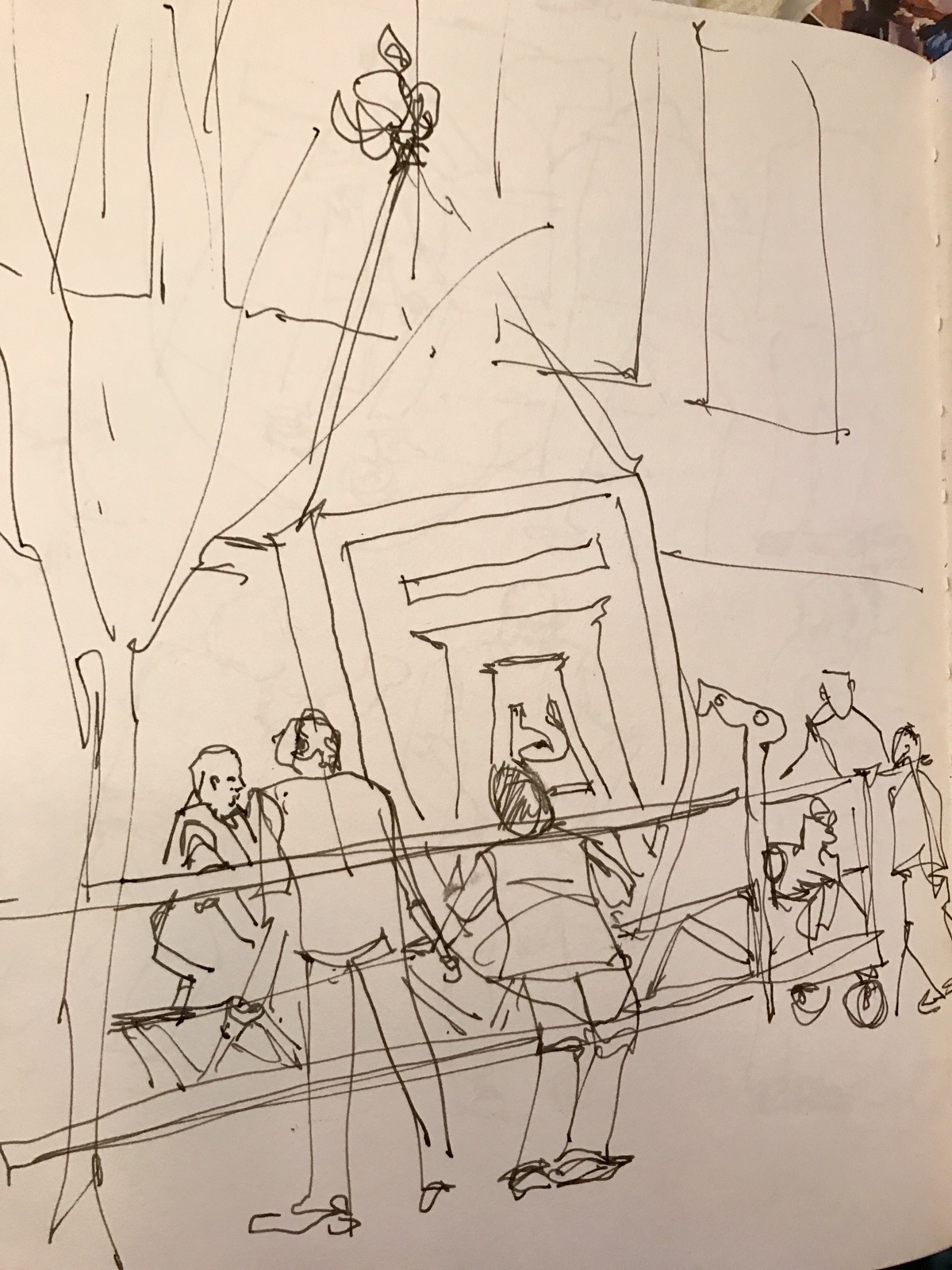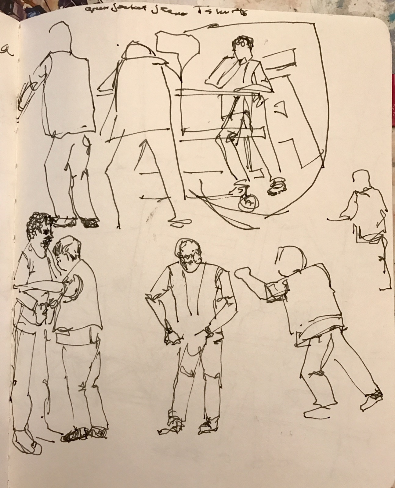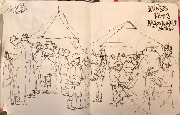 At the races. I was afraid to shop out my sketchbook after I did this because a certain bird was busy telling people what a great sketched I was.
