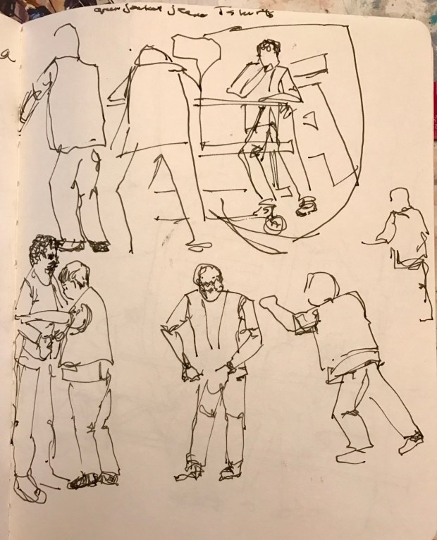 Here’s the original sketch. I painted these after I got home. Colors used Quin coral, gold,burnt orange. Cerulean and hematite geeen on windows with ultramarine and burnt umber shadows. The building is Quin coral and burnt umber. Their jackets are Lemon yellow and hematite green. The sign is ultramarine and mineral purple.