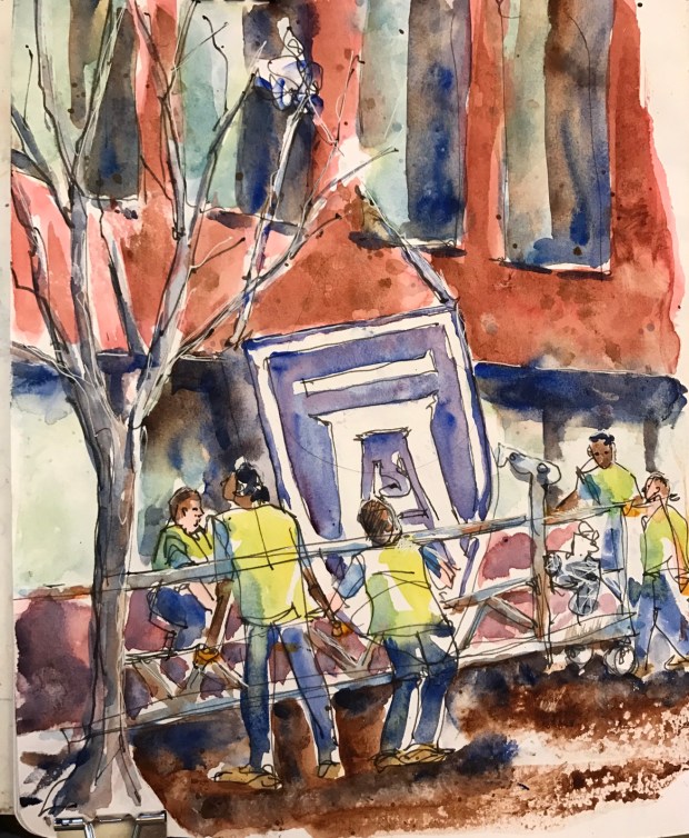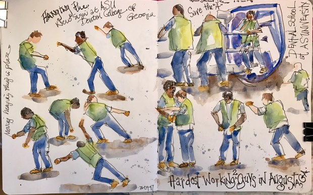 I drew these two guys last Thursday as part of my #oneweek100people2017 as they pushed and shoved the heavy scaffold into place that would allow them to hang the new Augusta State Univeristy sign four stories up in the air.