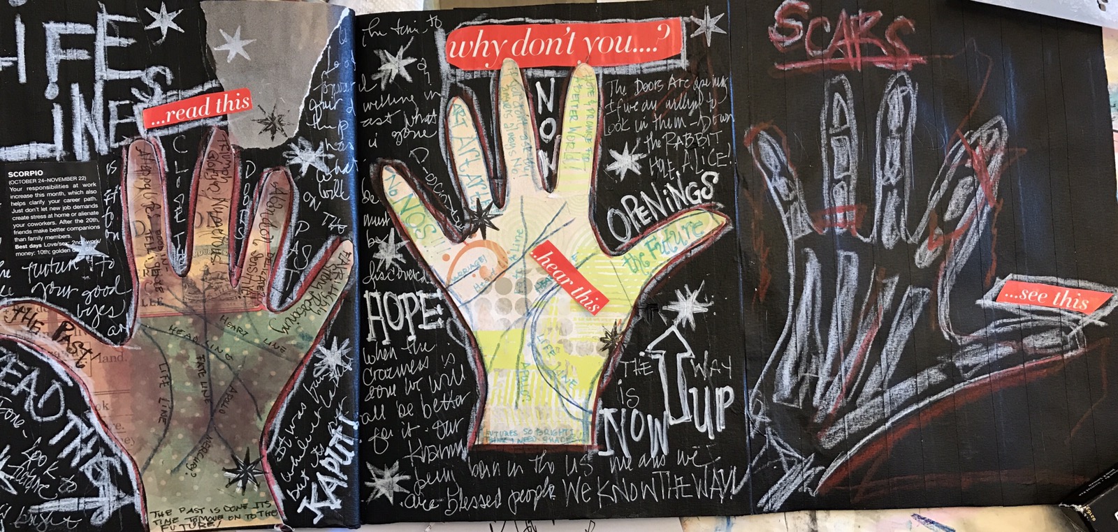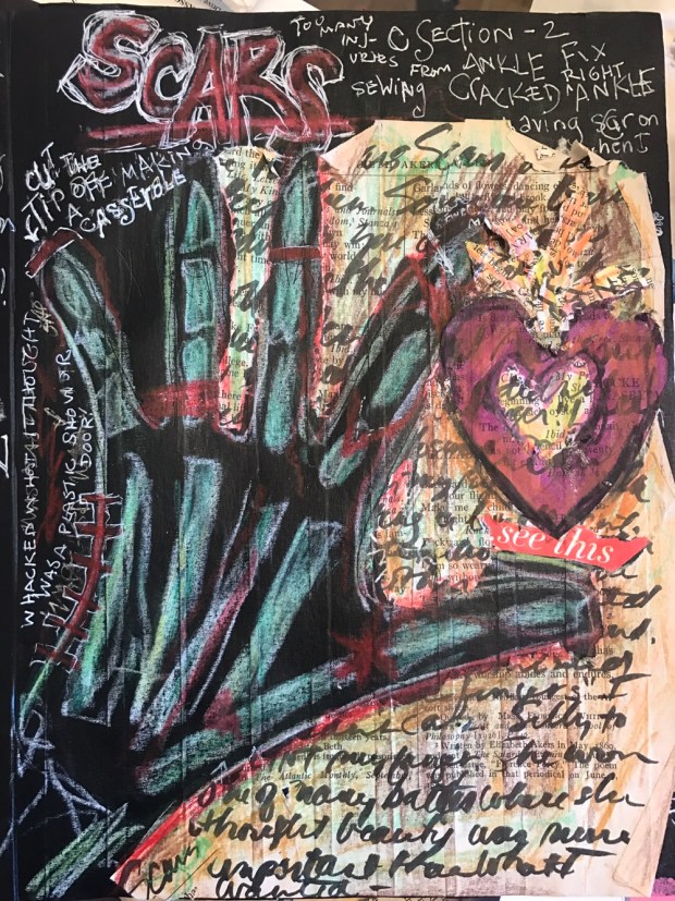 I colored the hand green with a Prismacolor art stick. The scar letter on the right was done in a page ripped from an old Bartletts quotations.