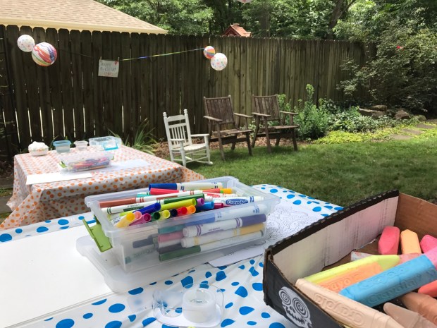 Art stations on go. Line strung on fence for paintings. Lots of markers and chalk.