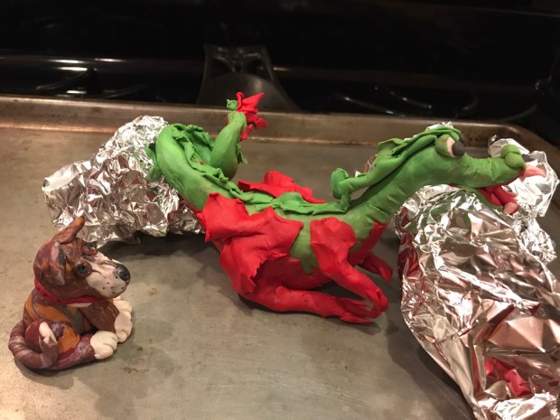 I was in charge of the Sculpey clay table. Of course I ended up making lots of sculpey animals. Henry and I had been reading a dragon book so I made him a couple of dragons. Here’s the big one with his tail propped up for baking.