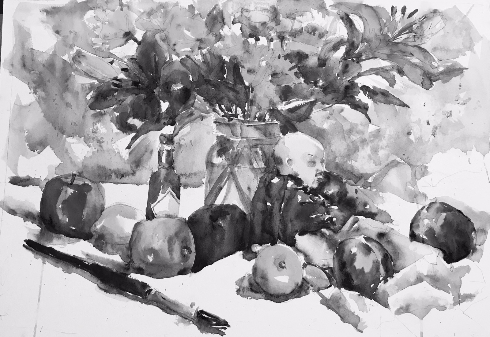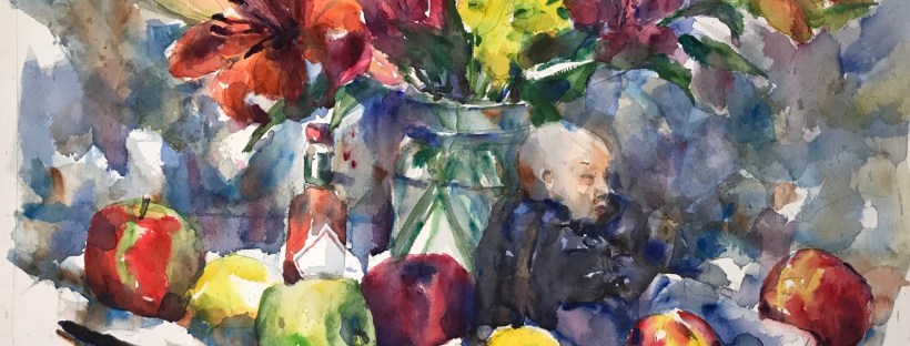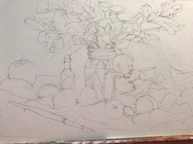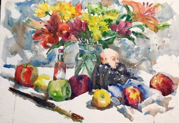 Half sheet on Richeson 300# cold press 15×20. Everybody hates my antique Kowloon doll in the painting so I tried to knock him back by loosing my whites on him and making him darker with ultramarine. I also washed his head with Quin burnt sienna and cerulean.  I did the same to the background to make the light flowers pop more.