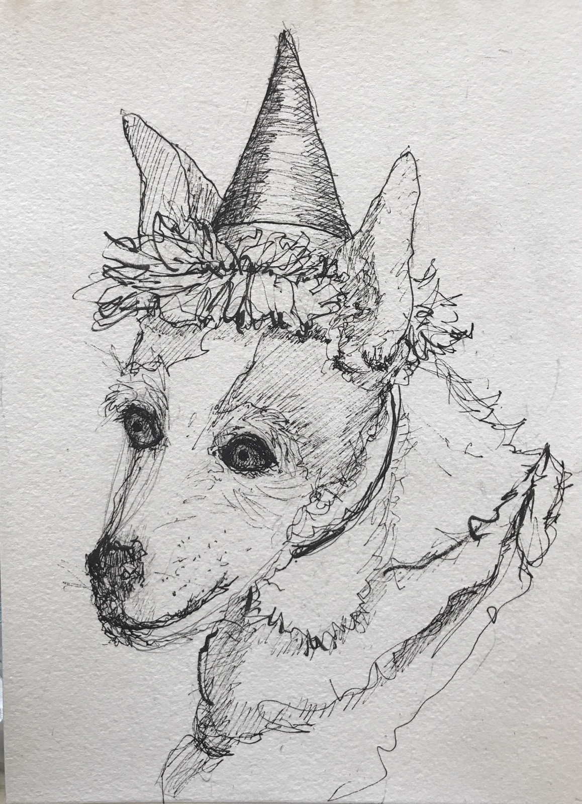 Pentel brush pen Lamy on fluid watercolor paper. Will get paint. I can fix her slightly off nose with paint.