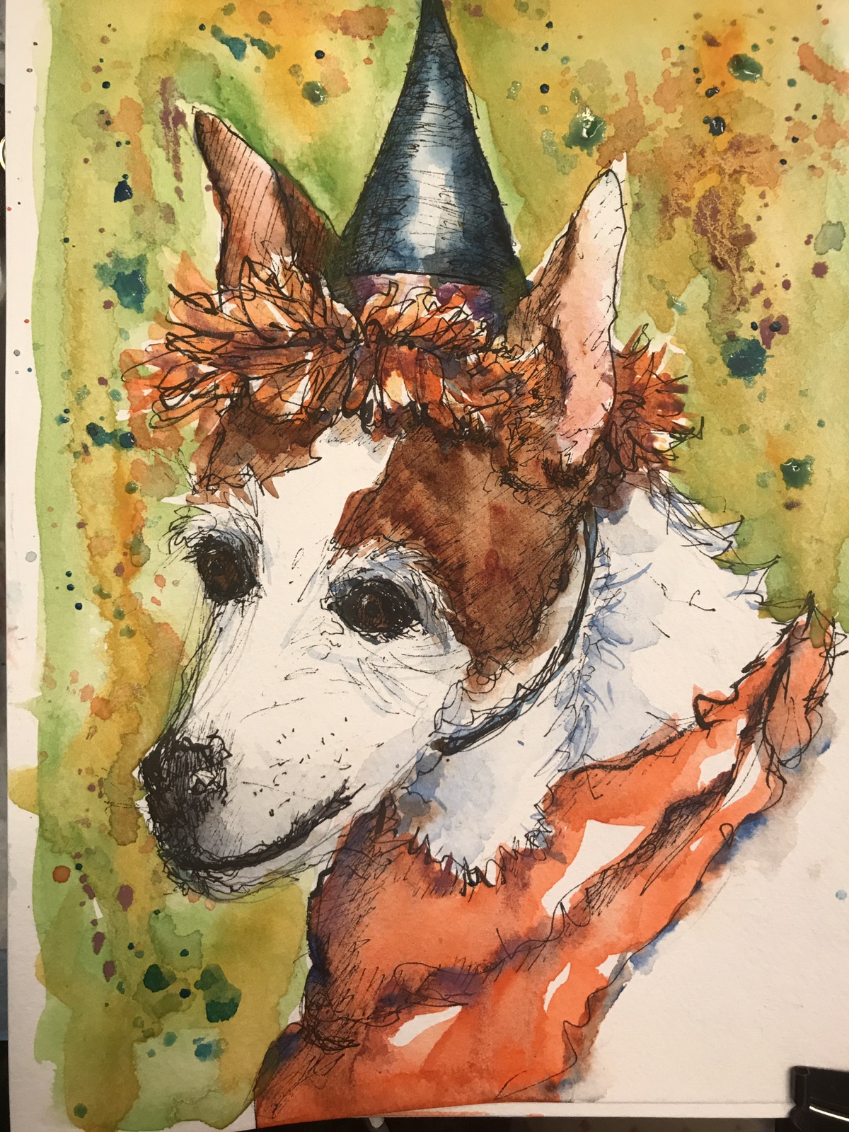 Paints used. Cerulean Burnt sienna burnt umber eyes. Cad orange and Indian yellow scarf and ruffle. Mineral violet and some odd blue on my palette for hat. Prussian maybe?!