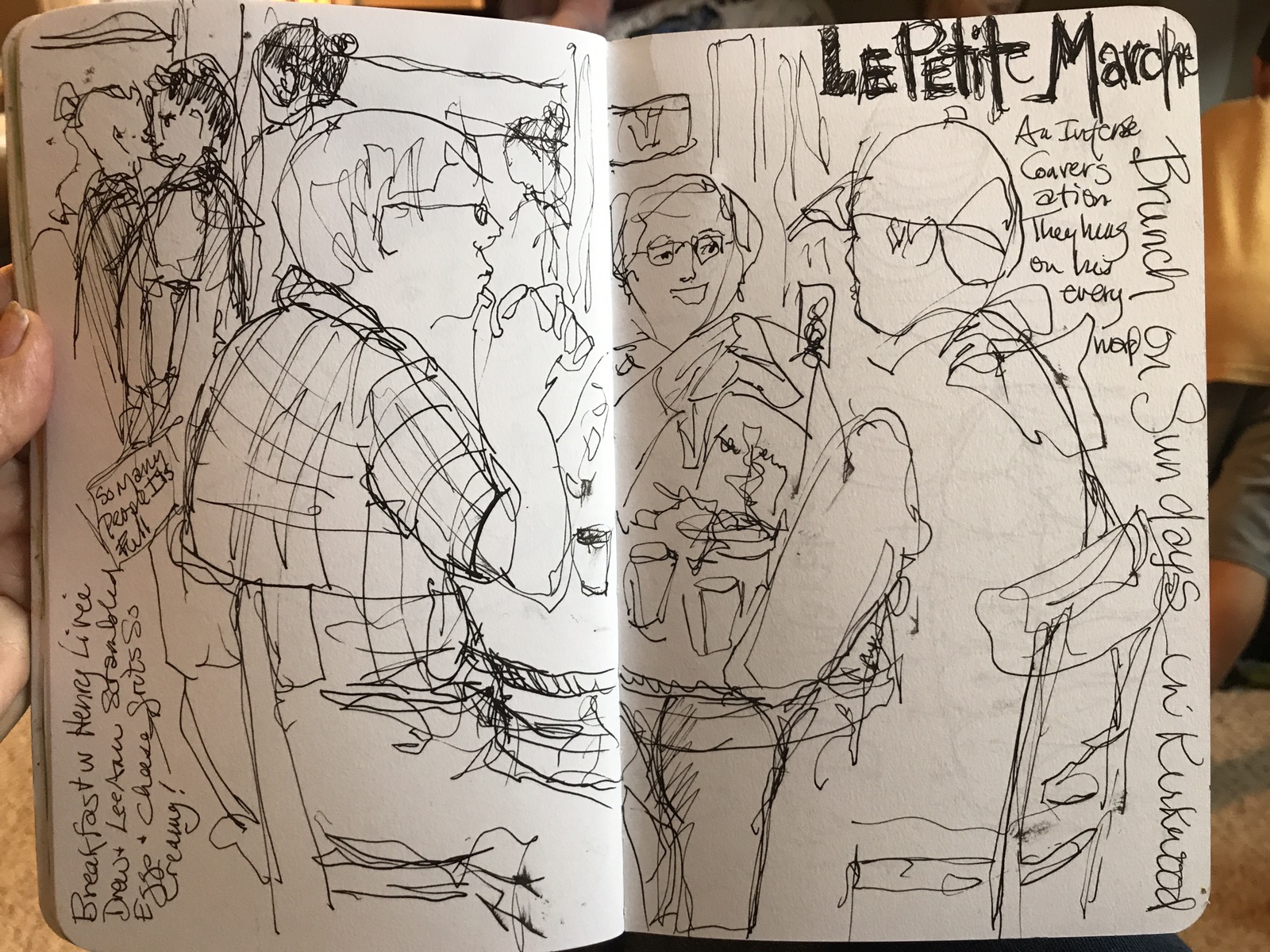 One of my favorite places to visit in Kirkwood. The foods great and the French ambience Atlanta style abounds. This is a view I rarely see when I eat there looking toward the front where the charm a la francais is especially evident. They were short a cook today so I had a lot of time to draw. YEAH!!! How often are you glad one of your fav restaurants is having serving problems?!!