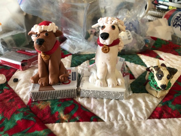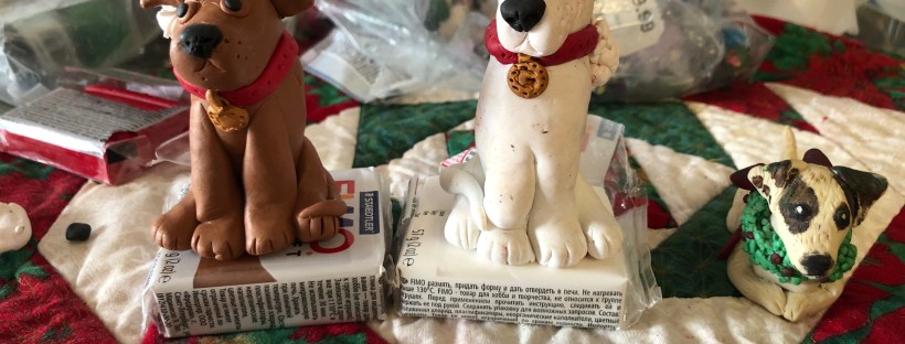 So posting a picture of what she’s up too. Making fimo polymer clay dogs for Christmas presents. They will both be pit bulls after they are baked and will be a present for their mom. The one on the right is our old JRT Charley. Zoe said she wanted one too. 🤗🎅🏻