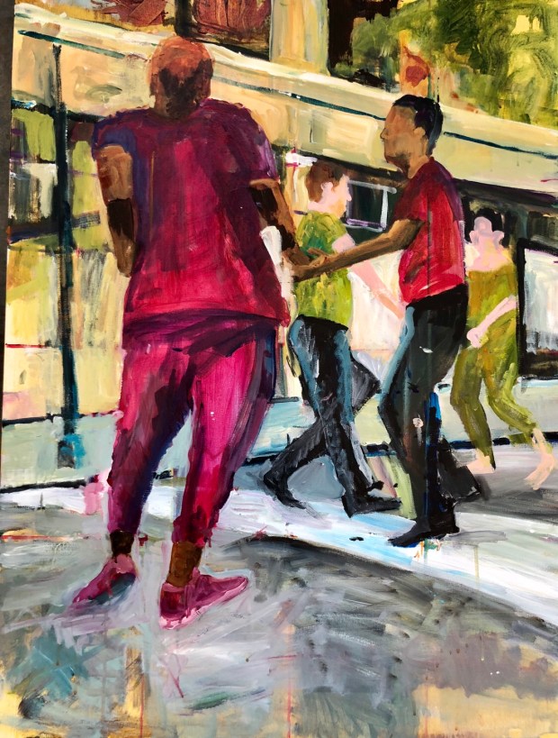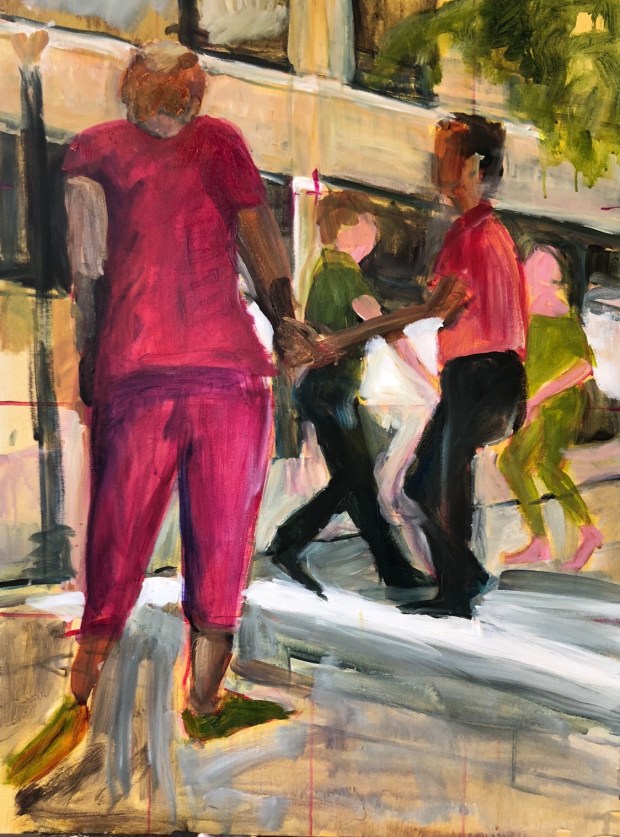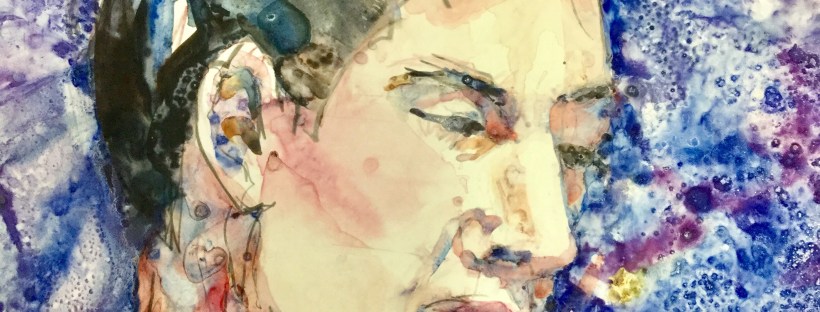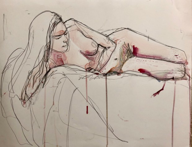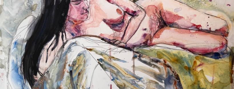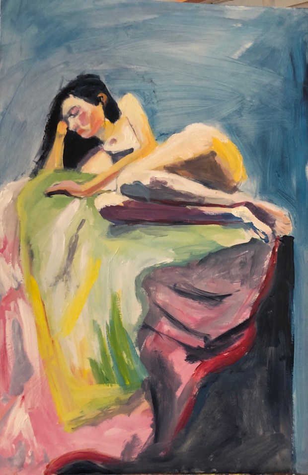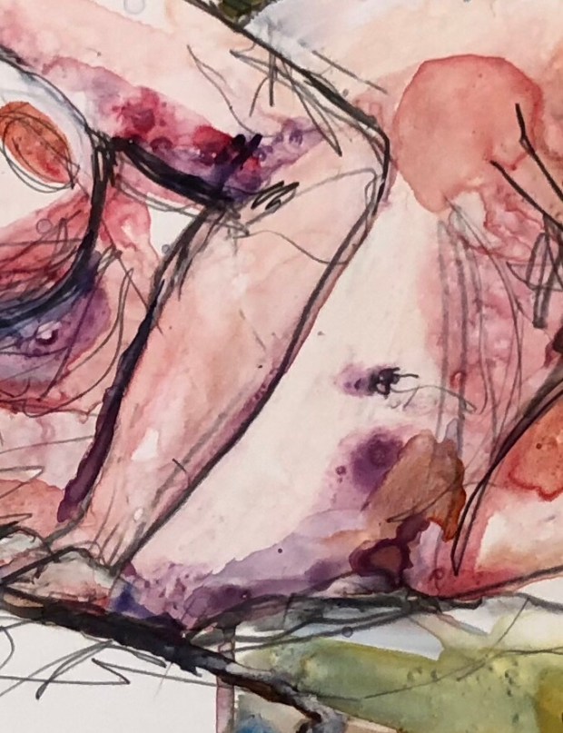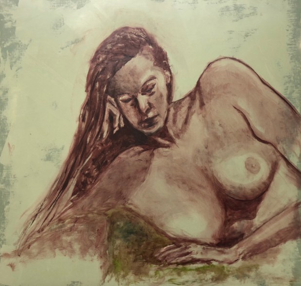 Then I repainted it. The eraser acted as a resist and made a highlight on her arm. The lighter area is where I erased.
