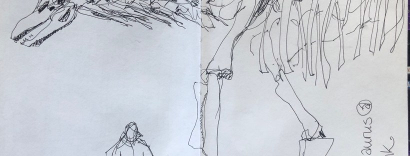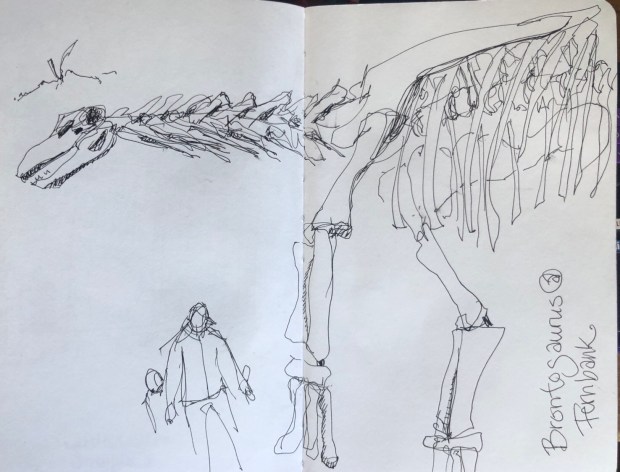This is the brontosaurus being chased by a T rex. I should have drawn the T rex but couldn’t find a seat where I could see it and I needed a seat by then.