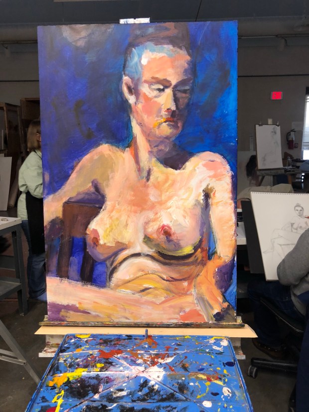 And I should have softened the edges more. Yuck. What else can I say!? Time flies when you only have an hour or so to paint a 19×24″ painting. Aka this ones going in the trash.