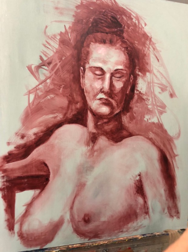 Hmmm nope. This took about an hour to paint. Should have listened to Charles Reid and not used ultramarine blue on her face. It gets too dark. And I needed more time on the face I think aka it’s not done. Maybe tomorrow?!!