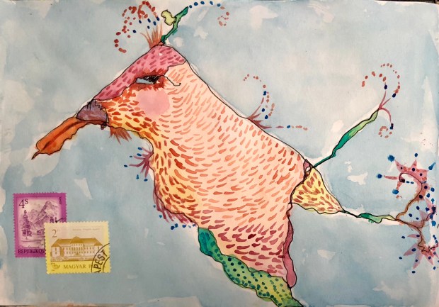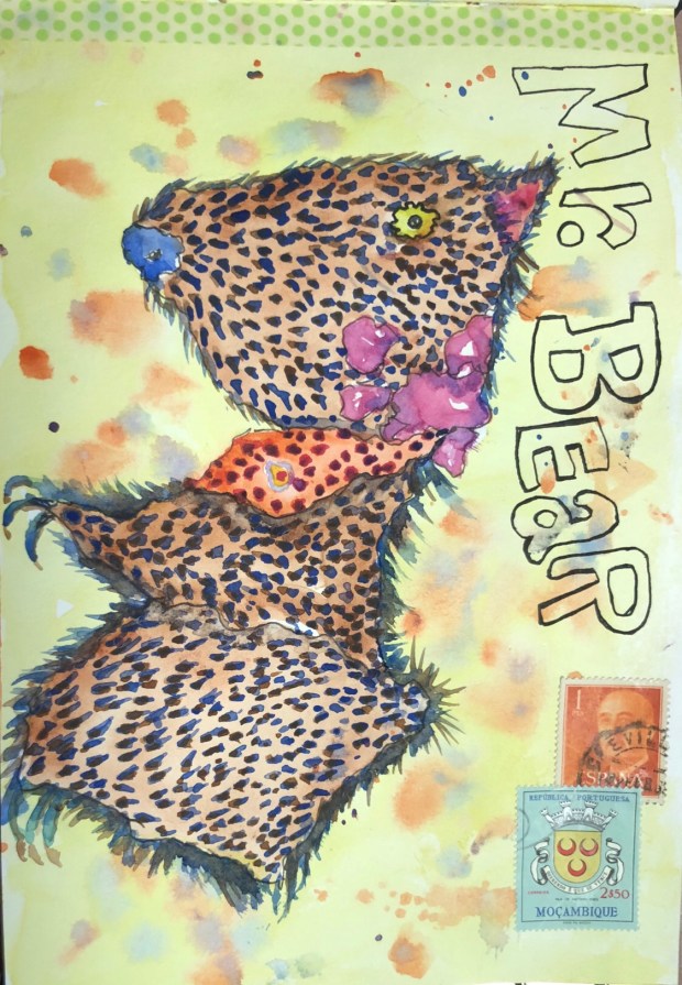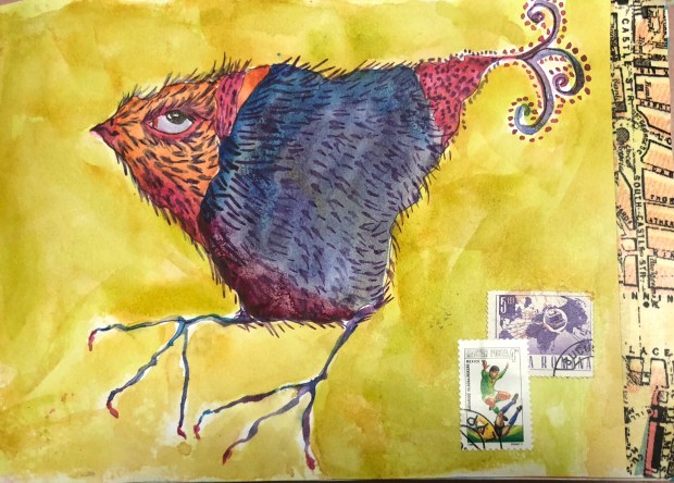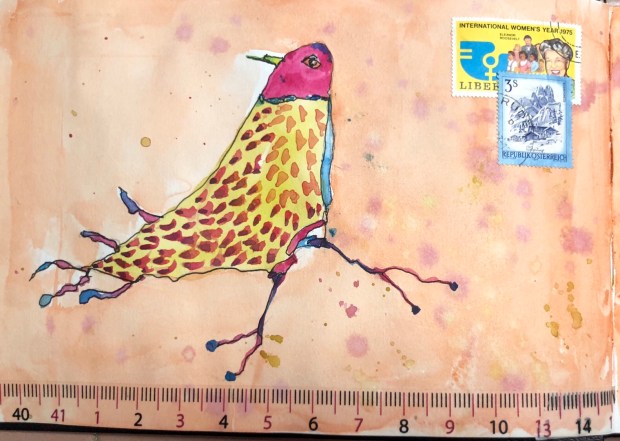 A bird whose definitely make I think. He needs a name. I also have bags of old stamps that I decided to glue onto the pages to fill it up.