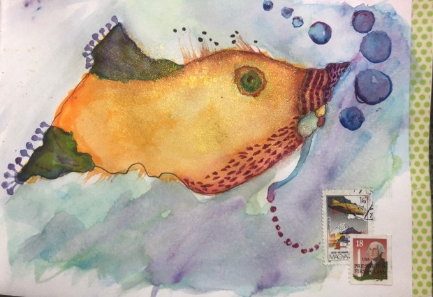 I was having so much fun painting this fish despite the marker streaks I got out my 2 watercolor travel boxes and some sable paint brushes and curled up on the sofa to play.