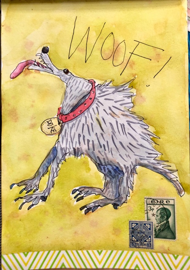My favorite dog – my version of an Irish Wolfhound. Notice the Irish stamps and the green and gold washi tape. This one is all watercolor. The background is quin gold and green gold.