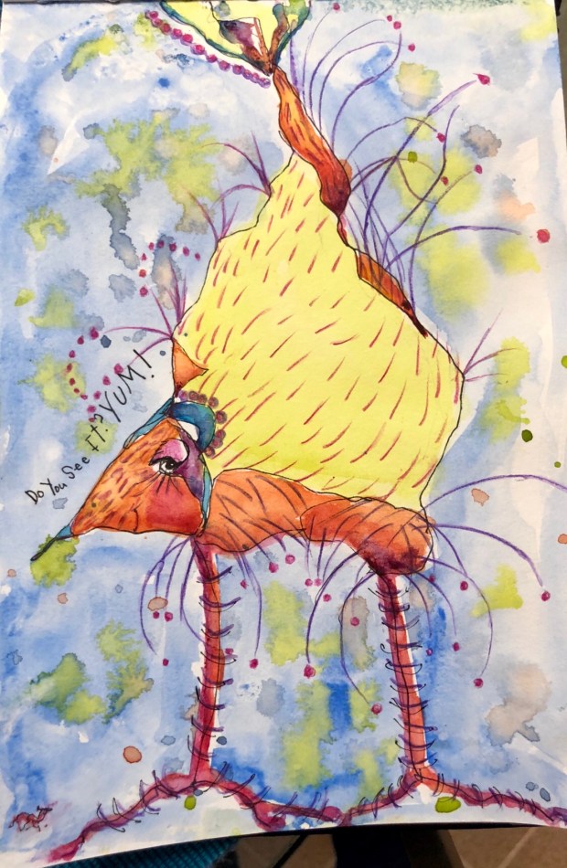 Finished by second break. Added some quin sienna and verditer blue background. Also some white gouache highlights.