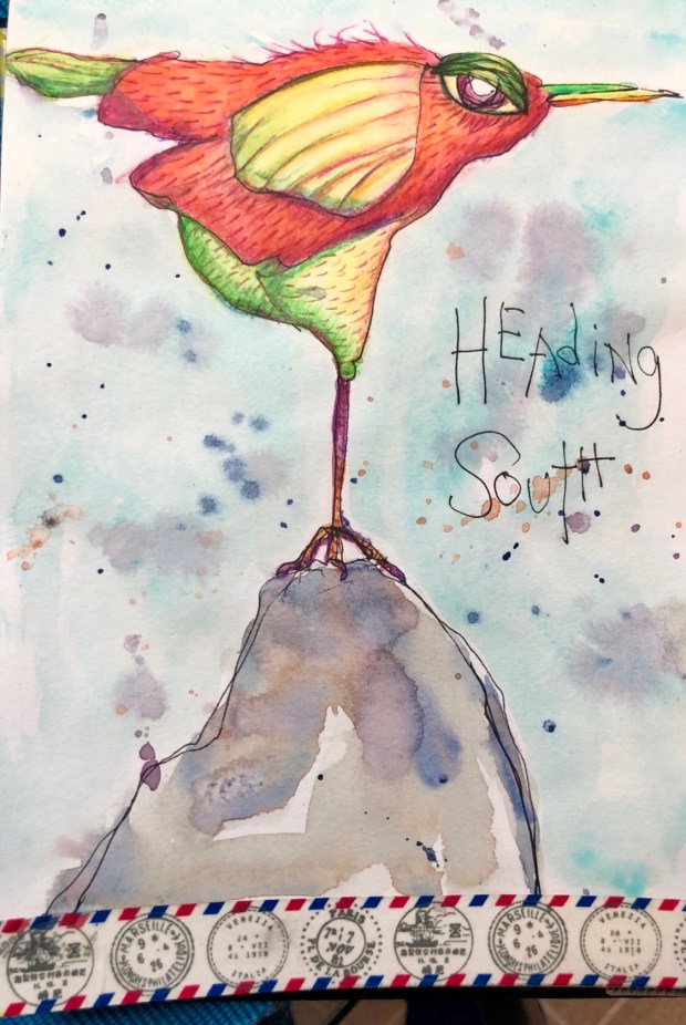 Thirty minutes. Base coat of quin coral and quin gold shadows of dioxzine purple and cerulean . Drawn with a 4b lead pencil.